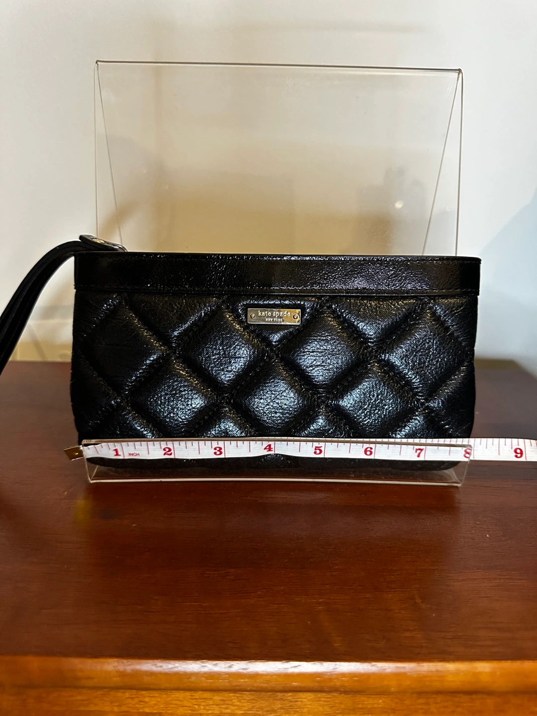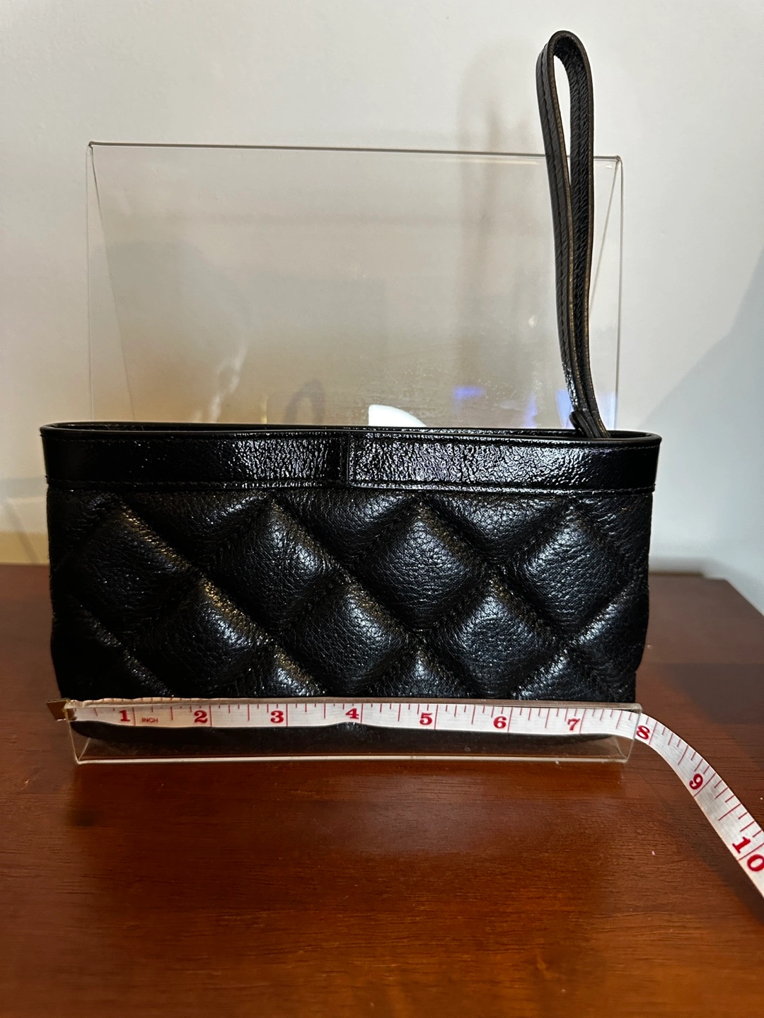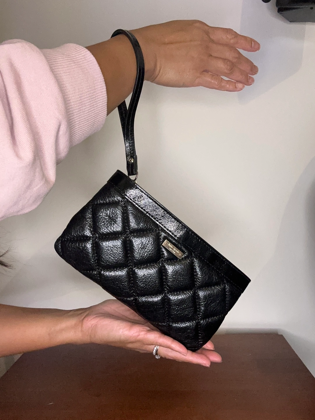 Pre-loved Black quilted 100% cow leather wristlet. Features goldtone hardware and a zip closure. Small enough for essentials. From a smoke-free home.
