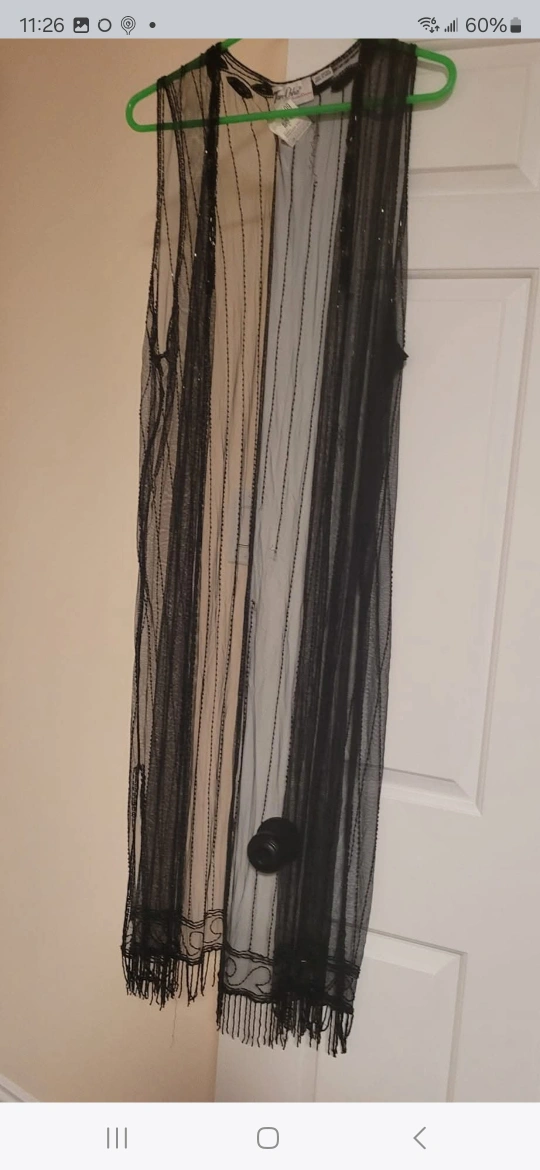 122Black sheer long sleeveless cardigan. Beaded details. Fringe trim. Open front. Elegant and stylish. #Halloween