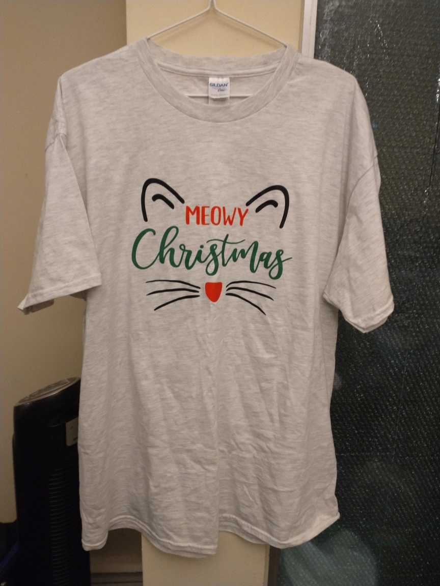 NEW!! LIGHT GREY CHRISTMAS T-SHIRT "MEOWY CHRISTMAS", WITH A CAT FACE. NEVER WORN. LENGTH: 28 INCHES , CHEST: 24 INCHES