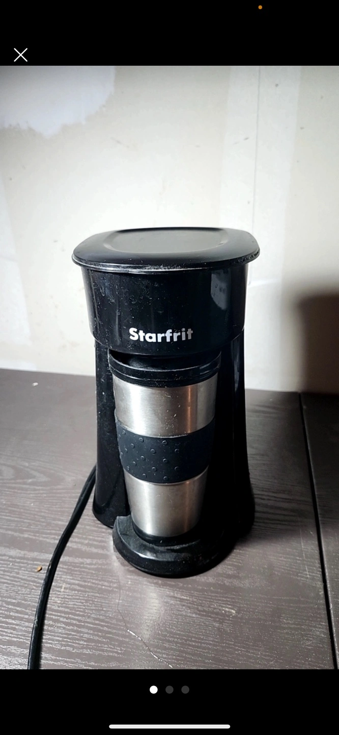 152Single serve coffee maker. Includes travel mug. Black plastic housing. Stainless steel travel mug.