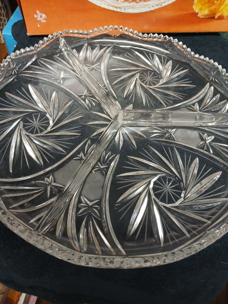 Three-compartment crystal serving platter. Intricate starburst design. Excellent condition. Comes in original box.