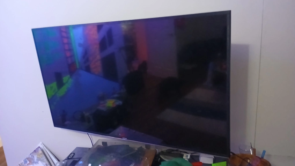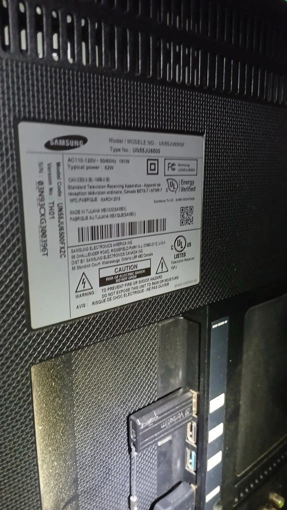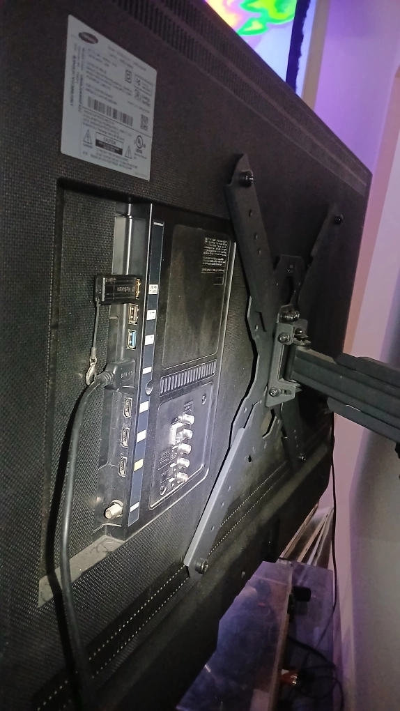 55-inch Samsung Smart TV. Wall-mounted with adjustable arm. Includes several ports and connections and remote. Great for home theatre. Base not included.