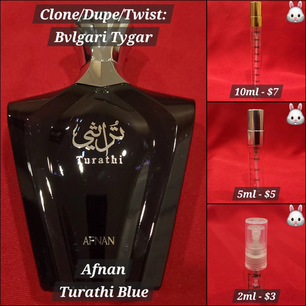 Afnan Turathi Blue perfume, a clone/dupe of Bvlgari Tygar. Available in 2ml, 5ml, and 10ml sizes. Black bottle with silver accents. Arabic script on bottle.