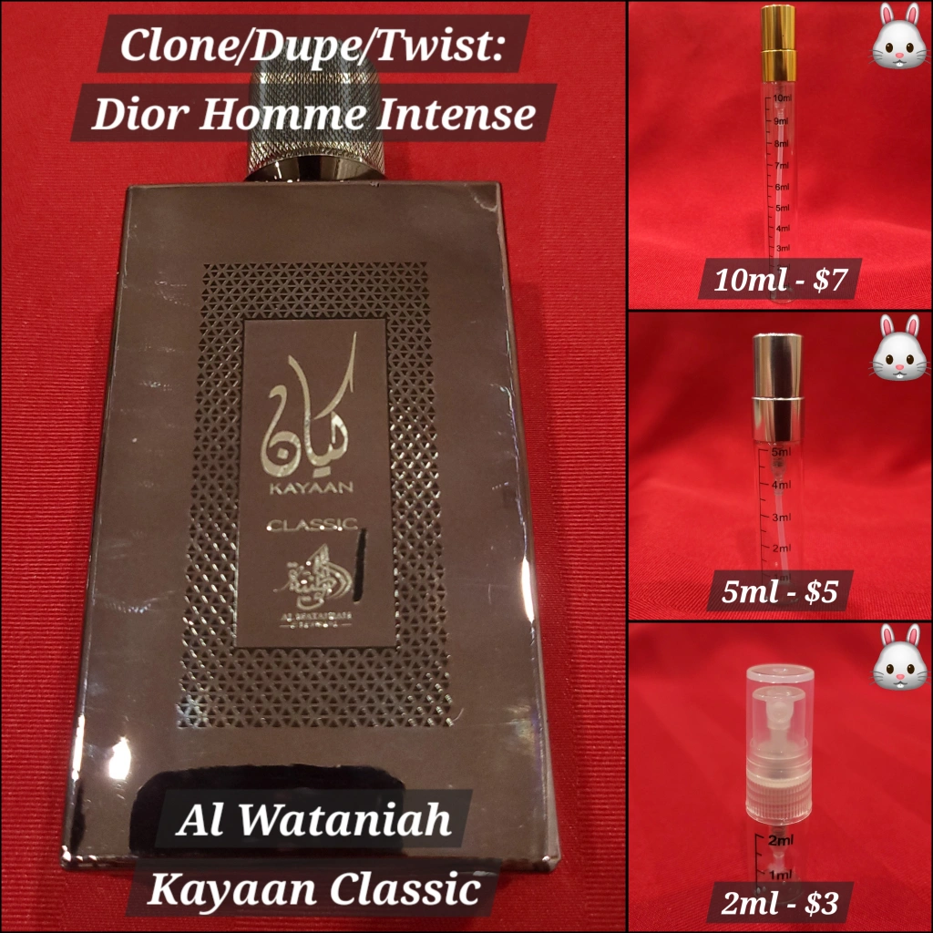Al Wataniah Kayaa Classic perfume, a dupe of Dior Homme Intense. Available in 2ml, 5ml, and 10ml sizes. Metallic silver bottle. Discreet, elegant scent.