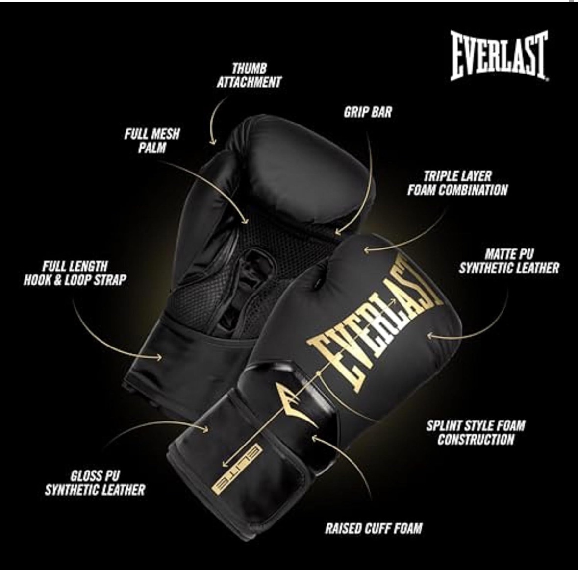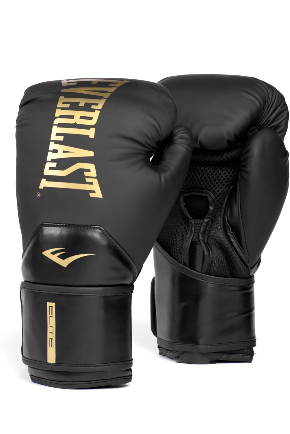 Pair of Everlast Elite boxing gloves. Black with gold accents. Features include full mesh palm, triple layer foam combination, and hook and loop closure. Great for training.