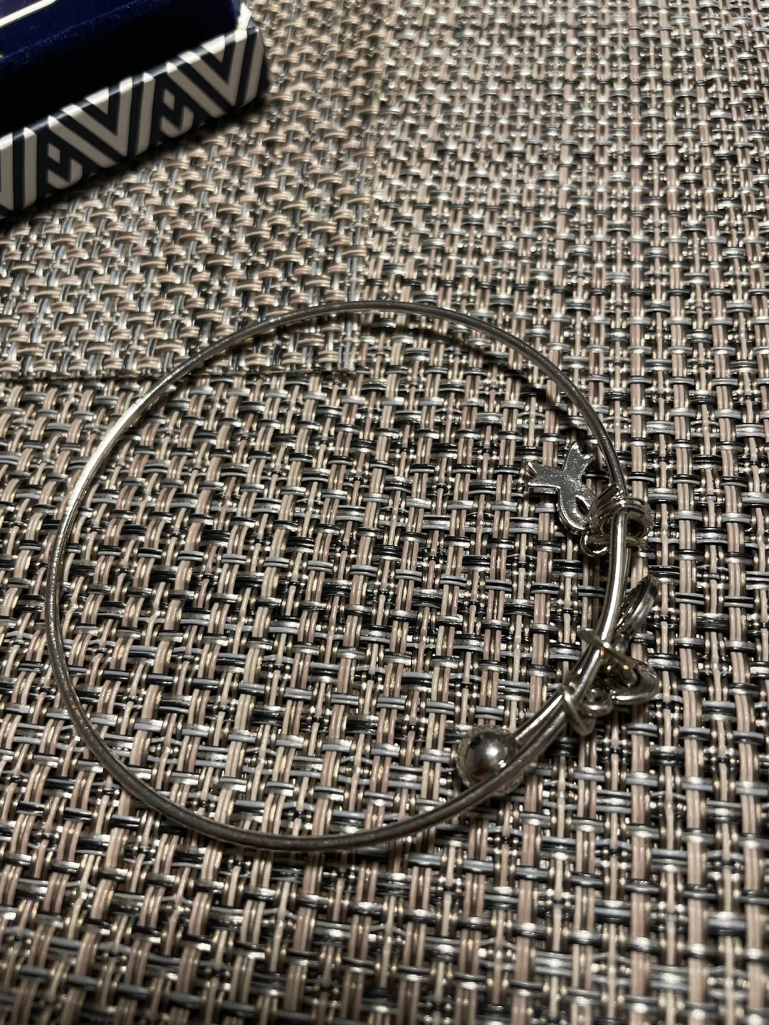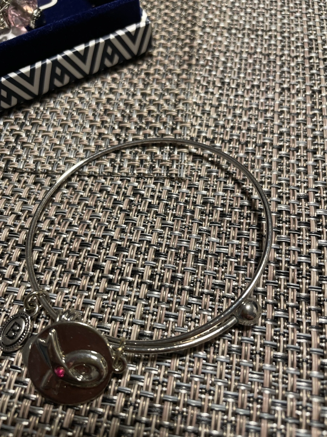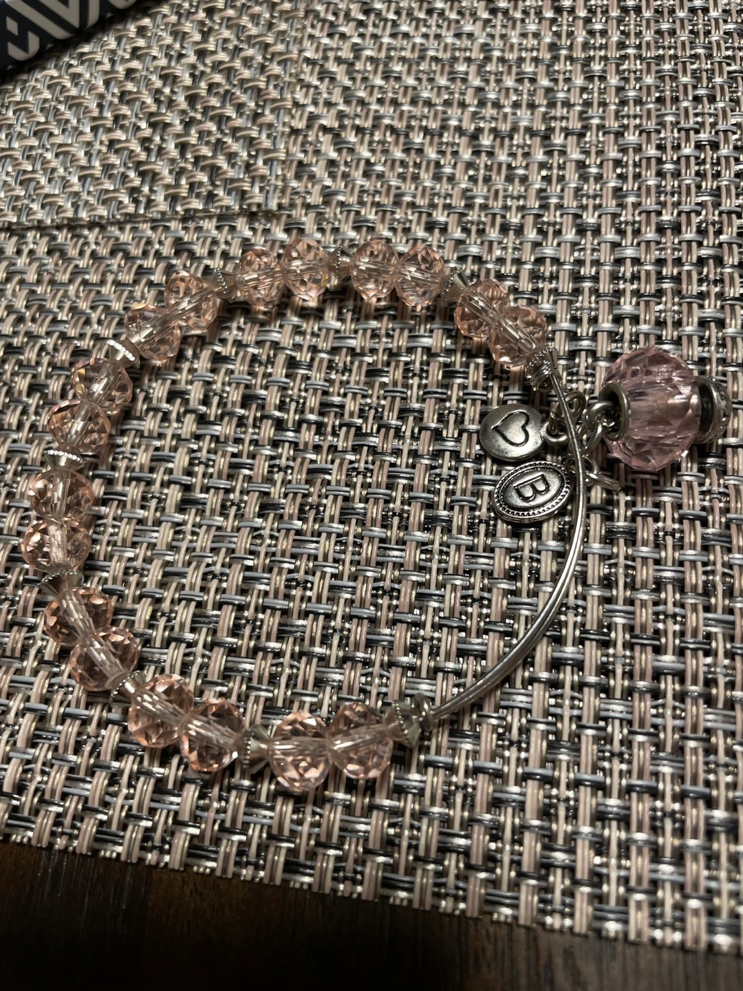 Three-piece bracelet set. Beaded bracelet, two wire bangles. New in box. Pink and silver tones.