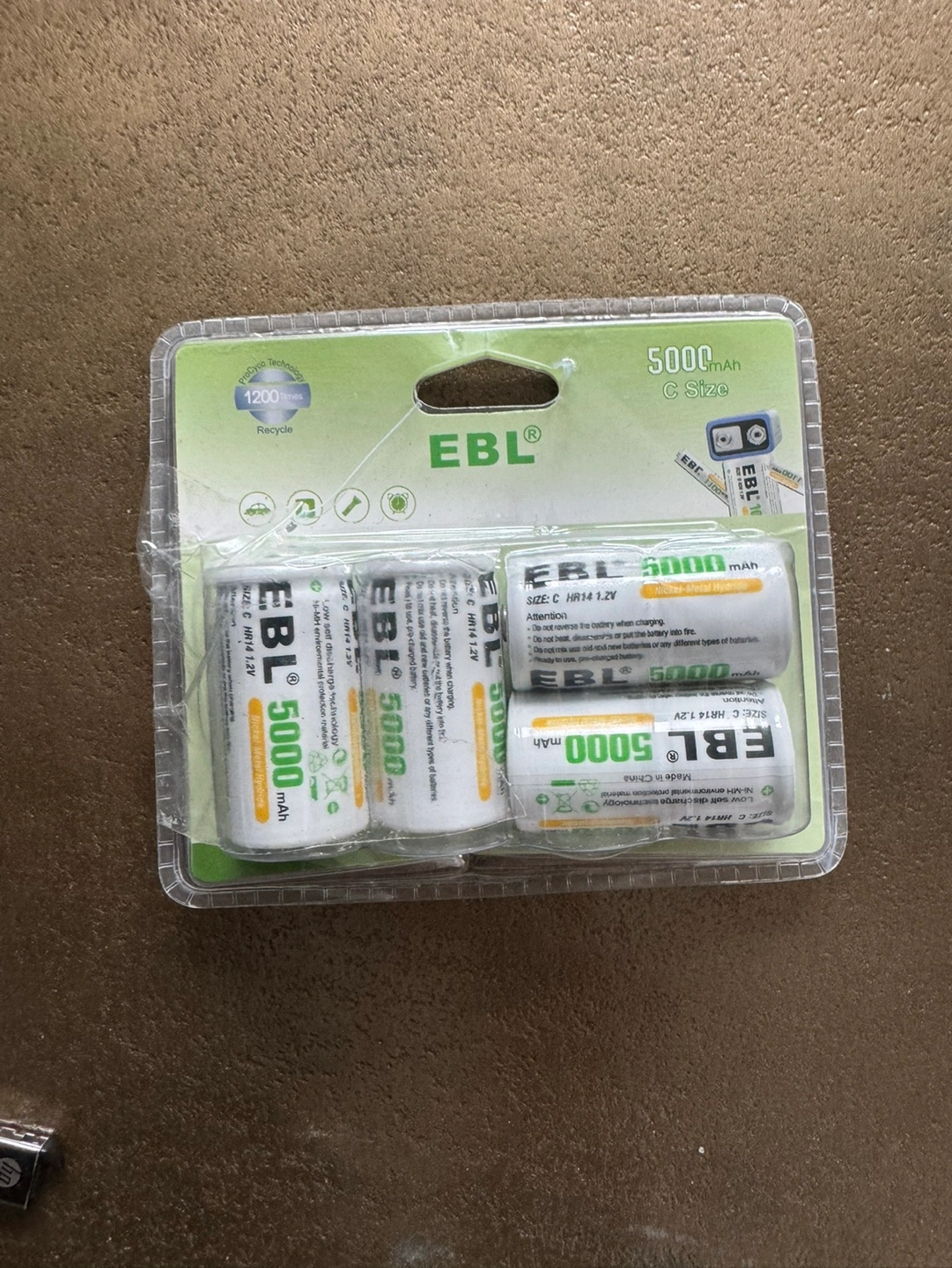 125Four EBL rechargeable C size batteries. 5000mAh capacity. Nickel-Metal Hydride. Low self-discharge technology.