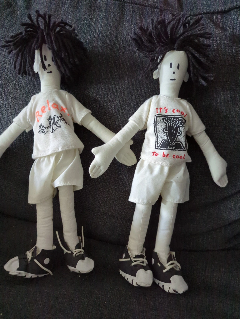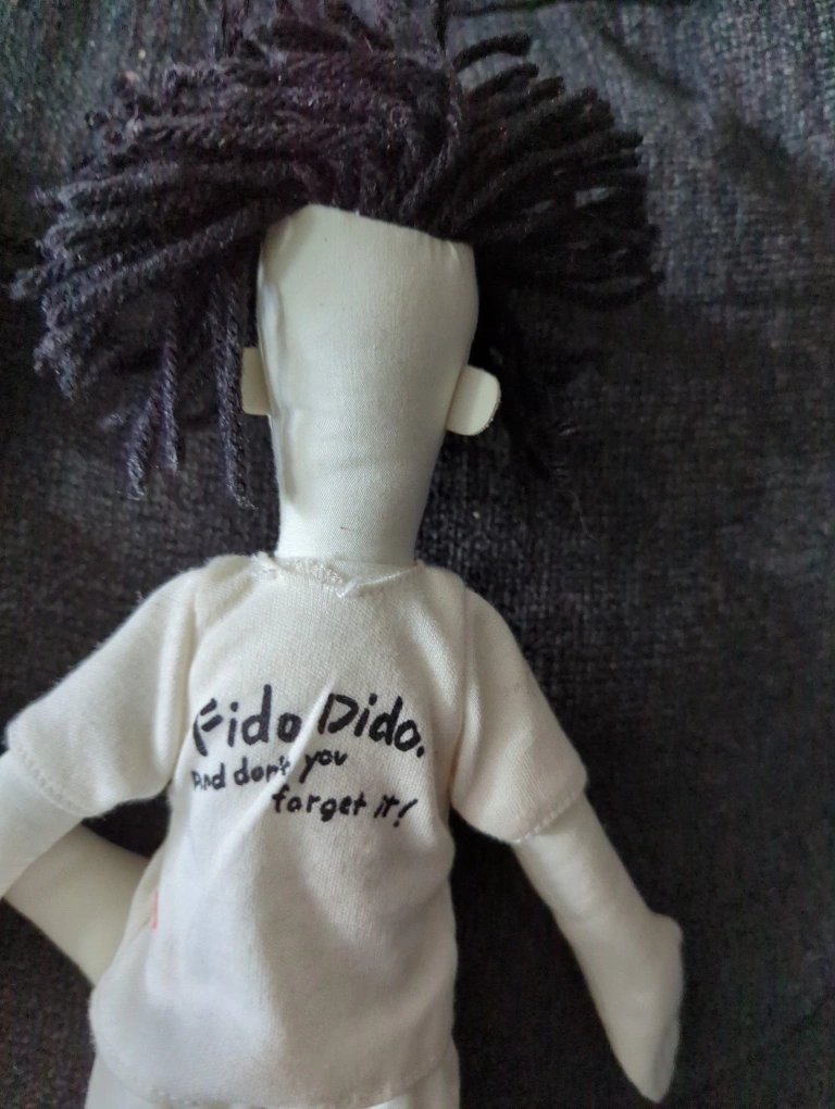 #freecycle. Very rare, original 1985 Fido Dido rag dolls. Each doll features a unique slogan on its shirt. Black yarn hair, white fabric body. Small shoes.