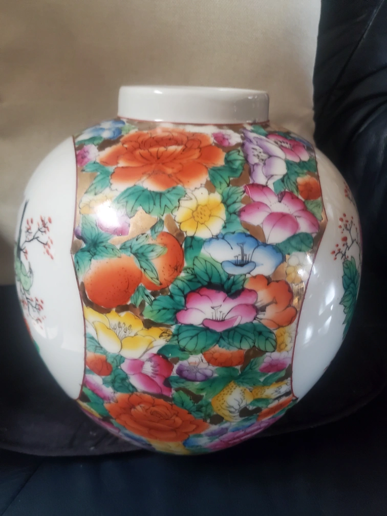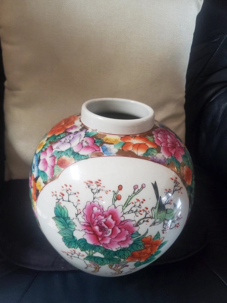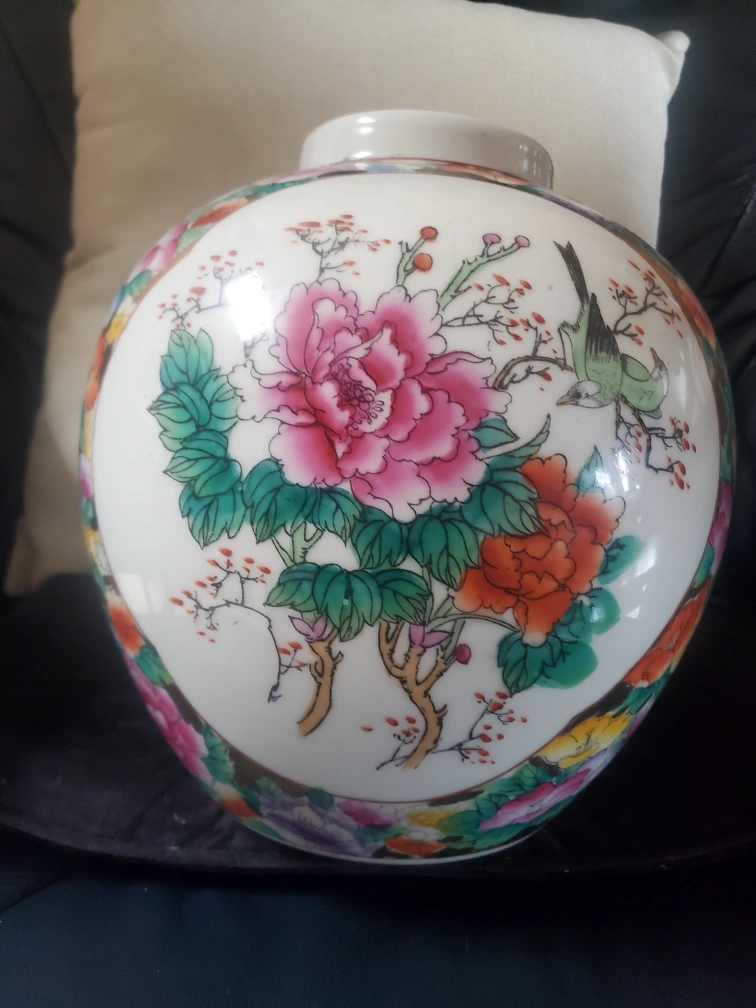 15Vintage Asian-inspired Porcelain Jar with Floral and Bird Design Ornate porcelain jar. Features colourful floral and bird motifs. Round shape. Nice decorative piece..