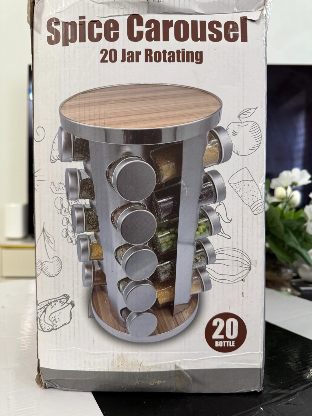261Rotating spice rack. Holds 19 spice jars. Metal and wood construction. New in box. NB: 1 spice jar broken. Available for trade too.