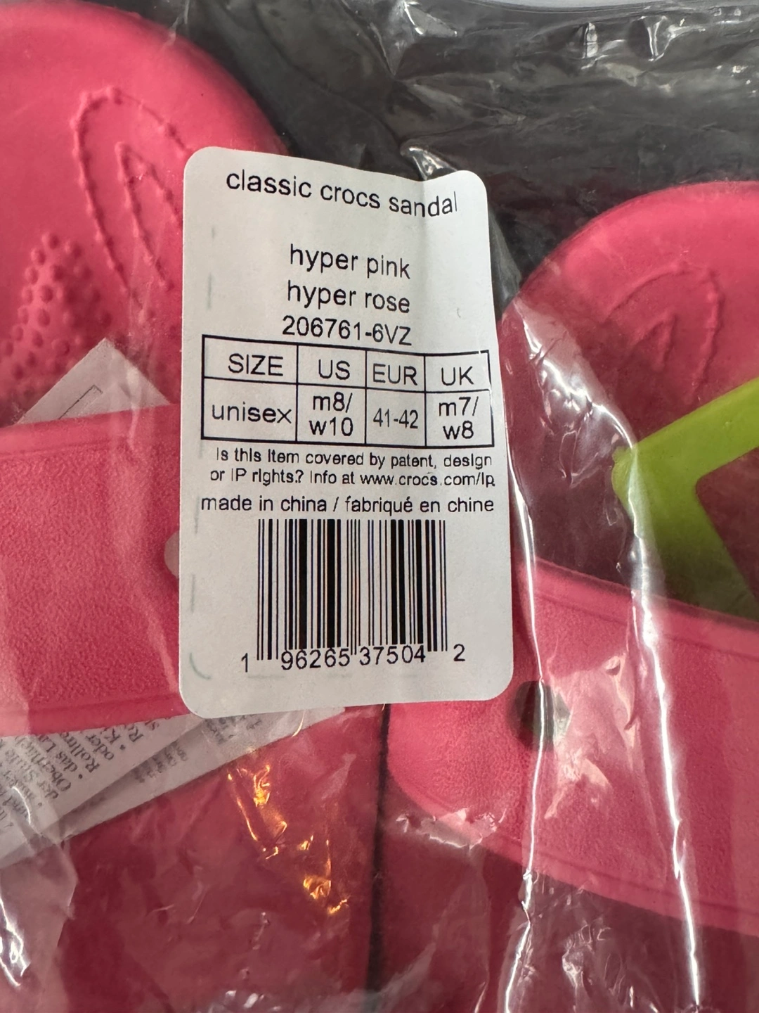 New in bag never worn. New, in package. Classic Crocs sandal. Hyper Pink colour. Unisex sizing, fits men's 8/women's 10. Made in China.