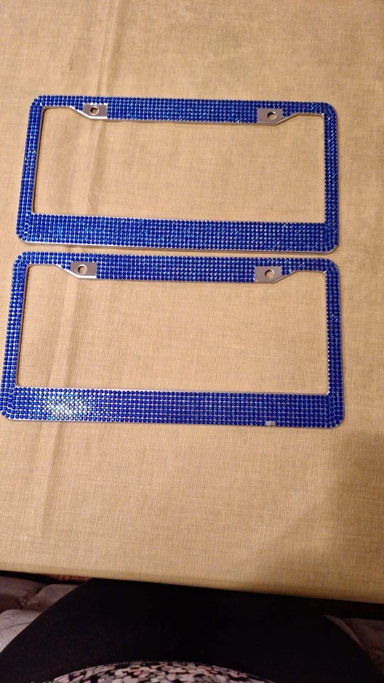 Two blue rhinestone license plate frames. Metal frames covered in small blue rhinestones. New, never used.