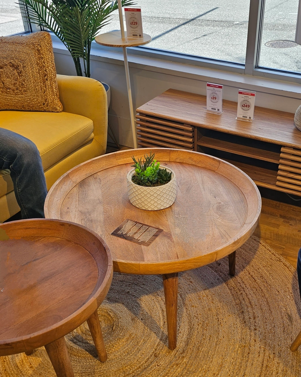 Beautiful round coffee table. Solid wood construction. Features a wide, circular tabletop and tapered legs. Perfect for living room. Diameter of 31.5 inches.