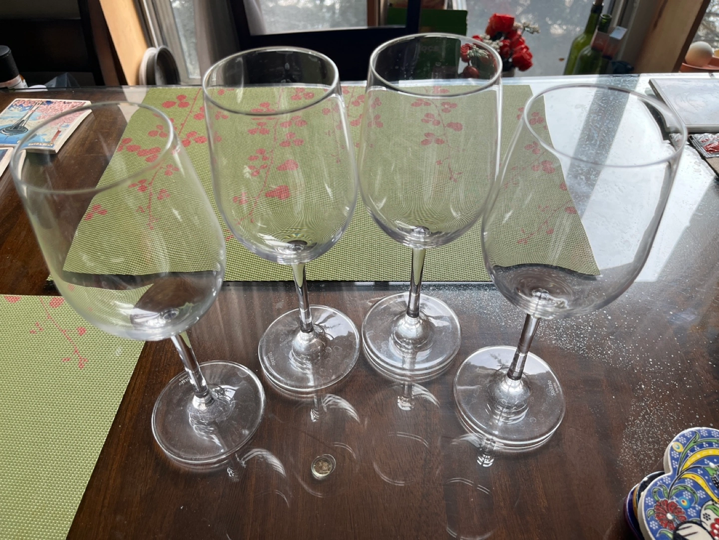 Four clear wine glasses. Elegant design. Perfect for entertaining.