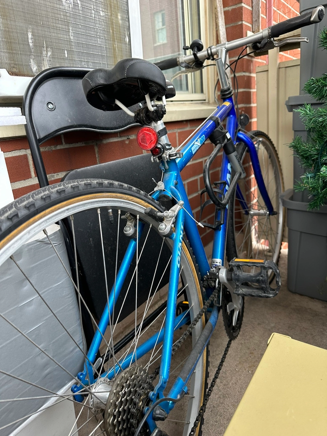 Used Giant Boulder Ridge mountain bike. Blue frame. Shimano gears. Kryptonite lock included. Shows wear from use.