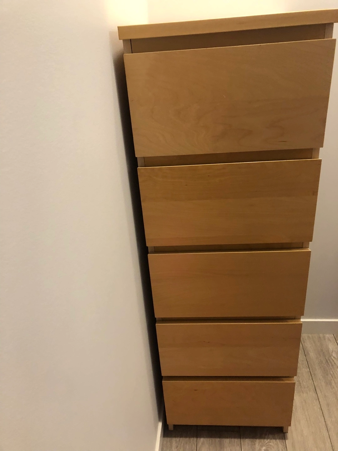 Tall five-drawer dresser. Light wood finish. Good storage solution.