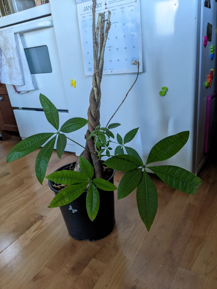 Healthy braided money tree plant in a black pot. Multiple stems, vibrant green leaves. Great addition to your plant family :)