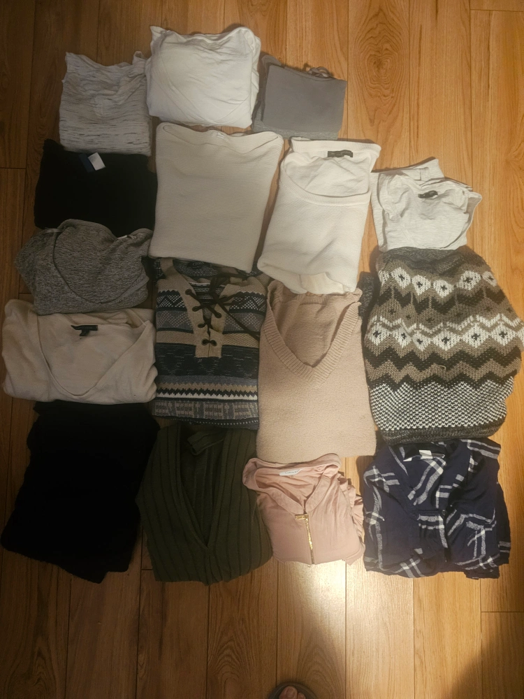 Large bundle of women's tops and sweaters. Various colours and styles. Includes long and short sleeves. Great for layering or mixing and matching.