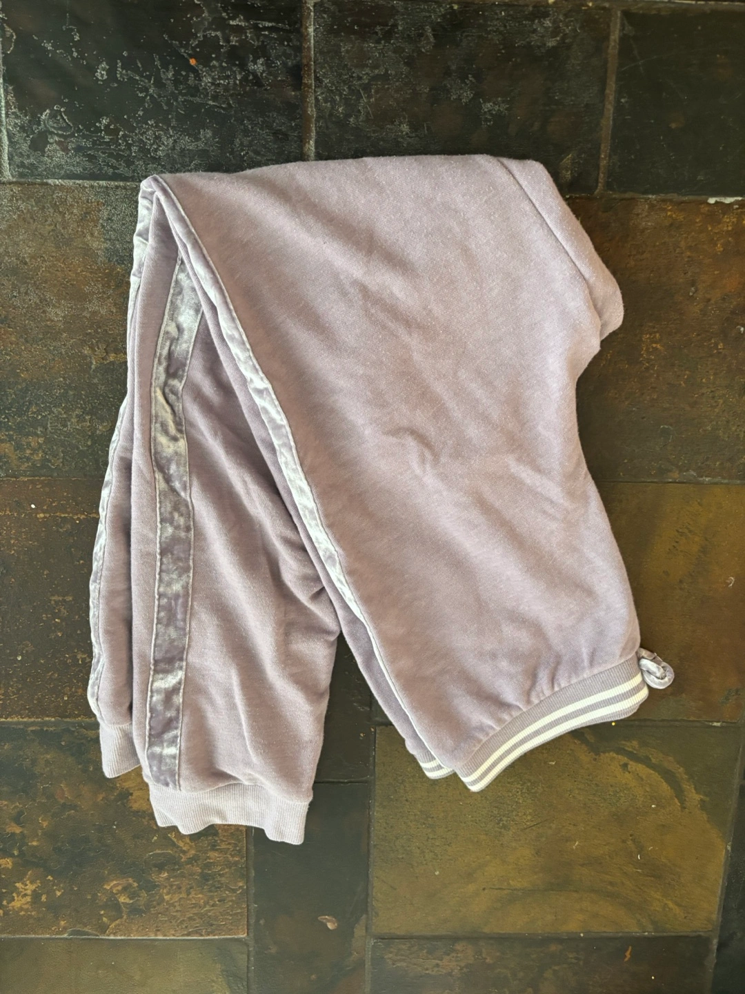 Xxl kids Lightweight lavender joggers. Features velvet side stripes and white ribbed cuffs. Gently used.