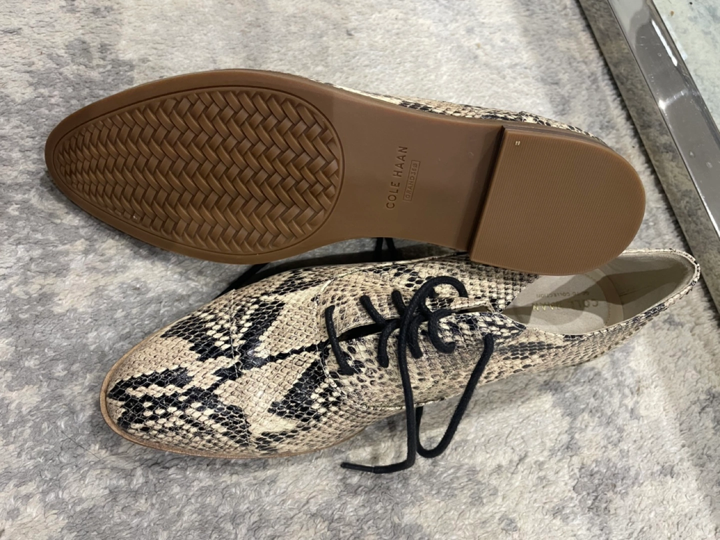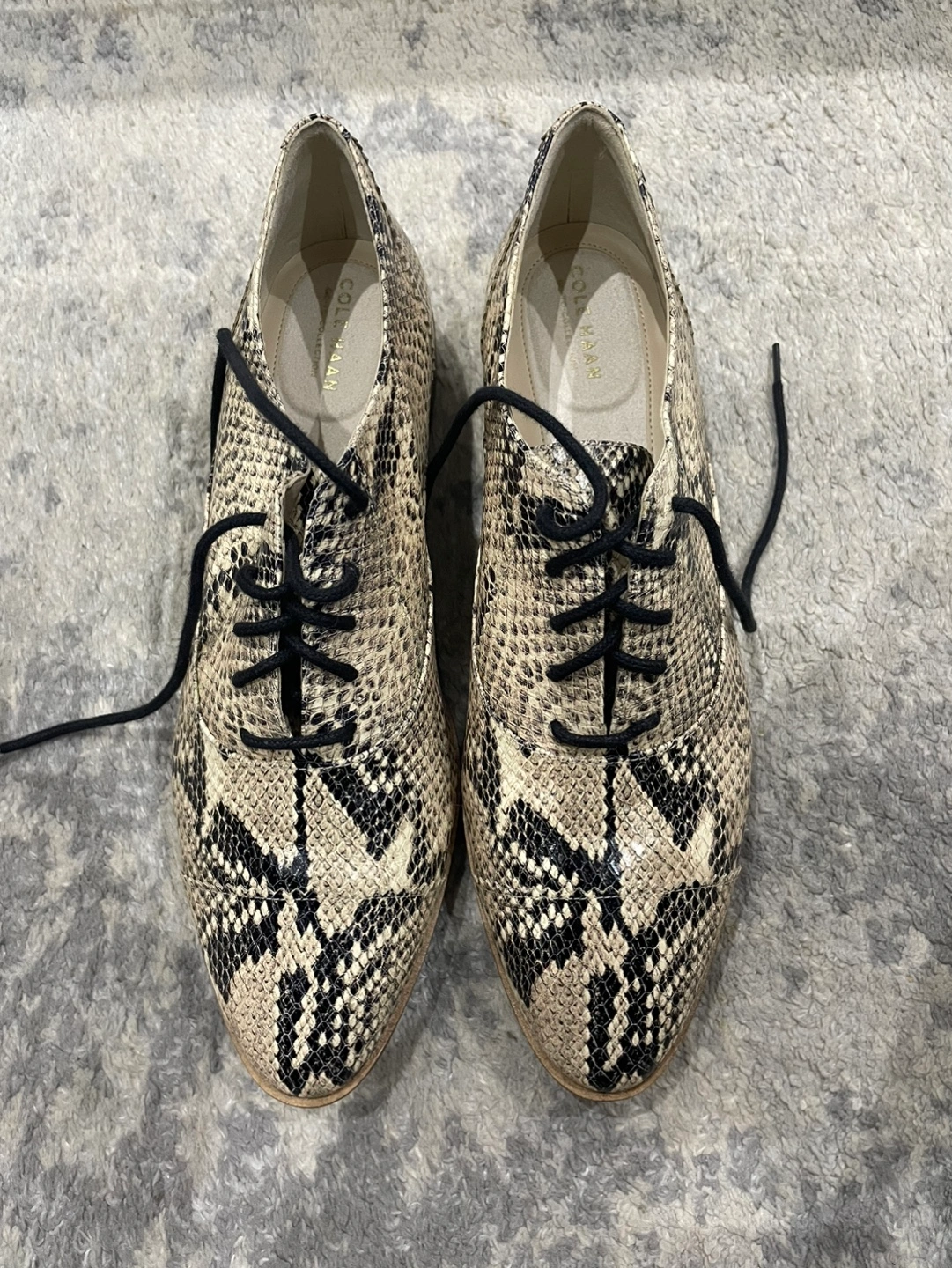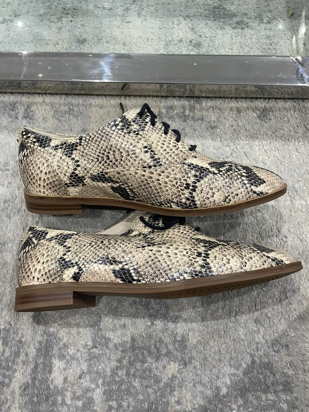 Women's oxfords. Snakeskin print. Lace-up closure. Low heel. Stylish and comfortable.