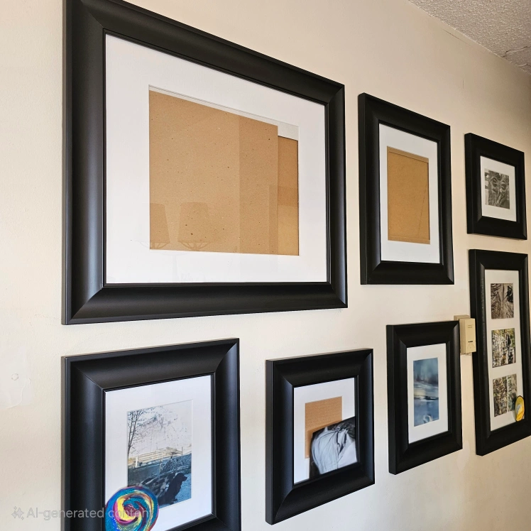 Seven black picture frames, various sizes. Contains matting. Great for displaying photos or artwork. Modern minimalist style, says AI. Fit together nicely for a feature wall. includes hanging hardware!