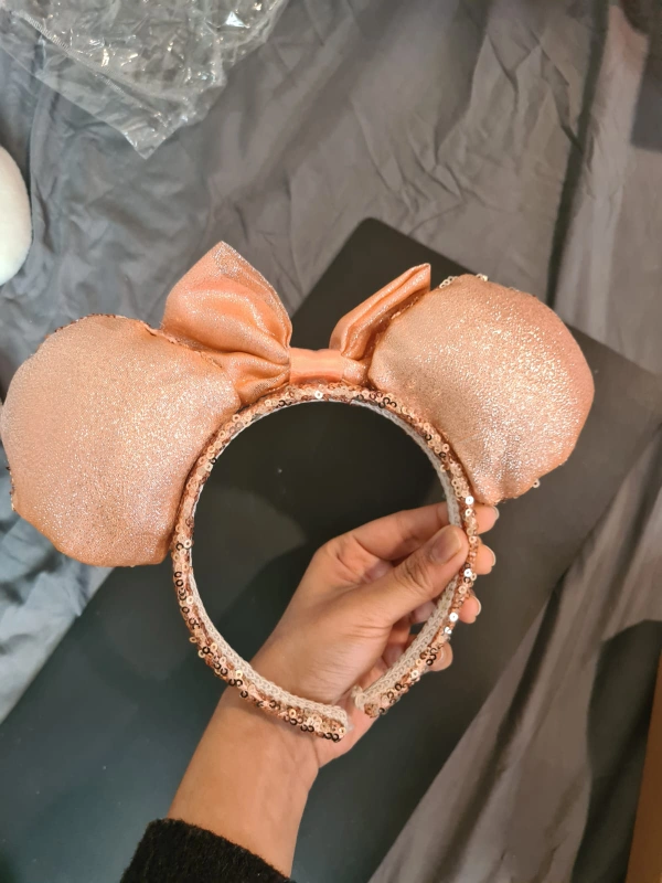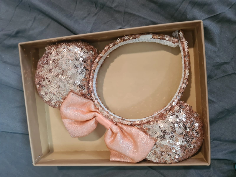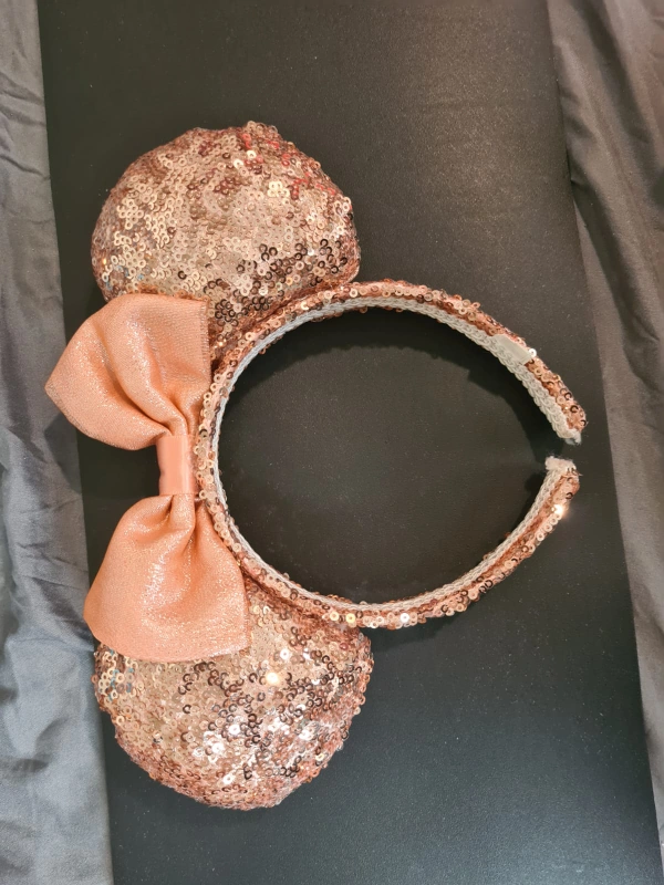 Sequinned rose gold Minnie Mouse ears headband. Features a matching rose gold bow. comes with a box. Perfect for Disney parks or any special occasion.
