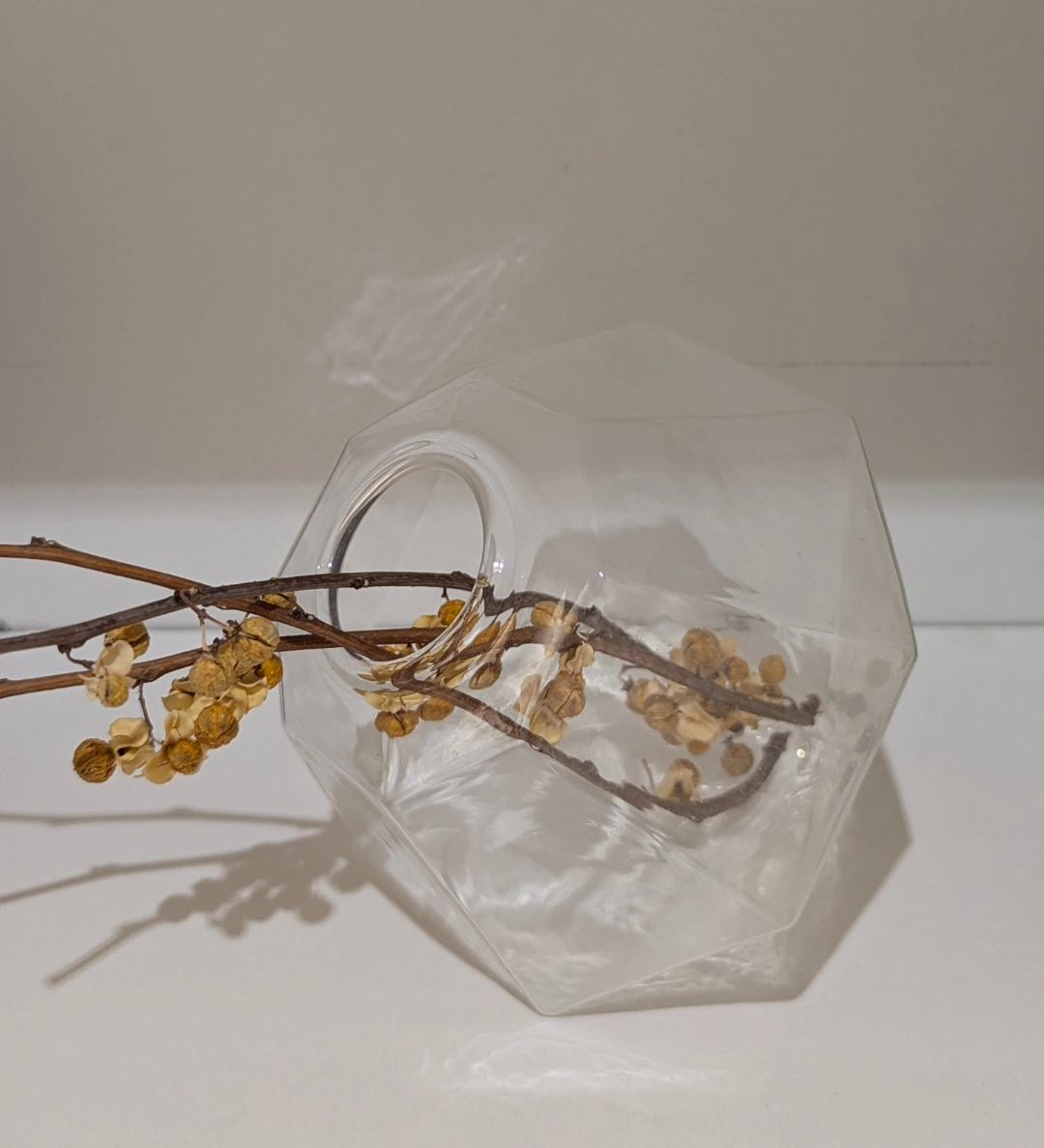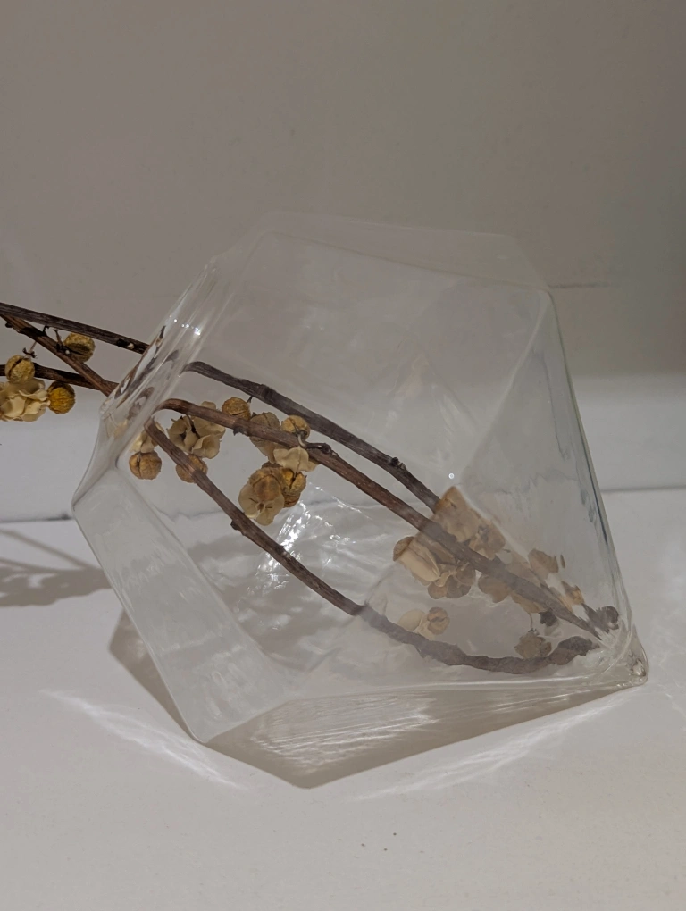 Unique clear glass vase in an octagonal diamond shape. Small opening at the top for dried flowers or small house plants. Modern and minimalist design.