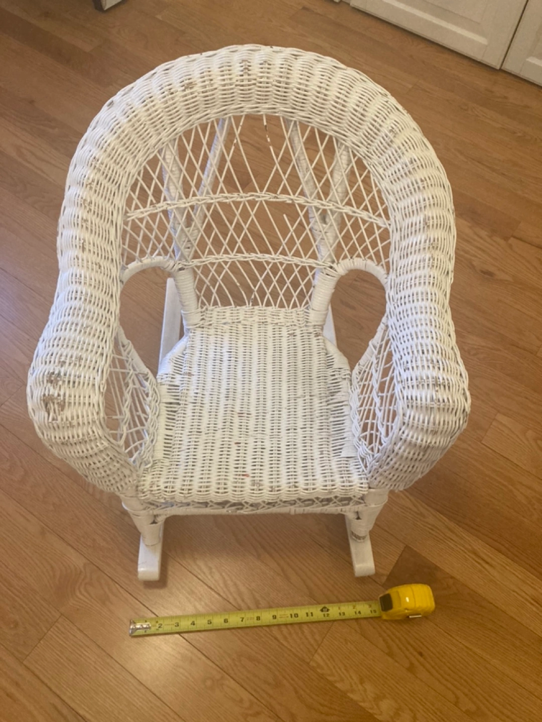 Adorable white wicker rocking chair. Perfect for a child's room or nursery. Gently used, shows minor wear. Measures approximately 15”w x 23”h x 11..5”d (seat depth, not leg depth).
