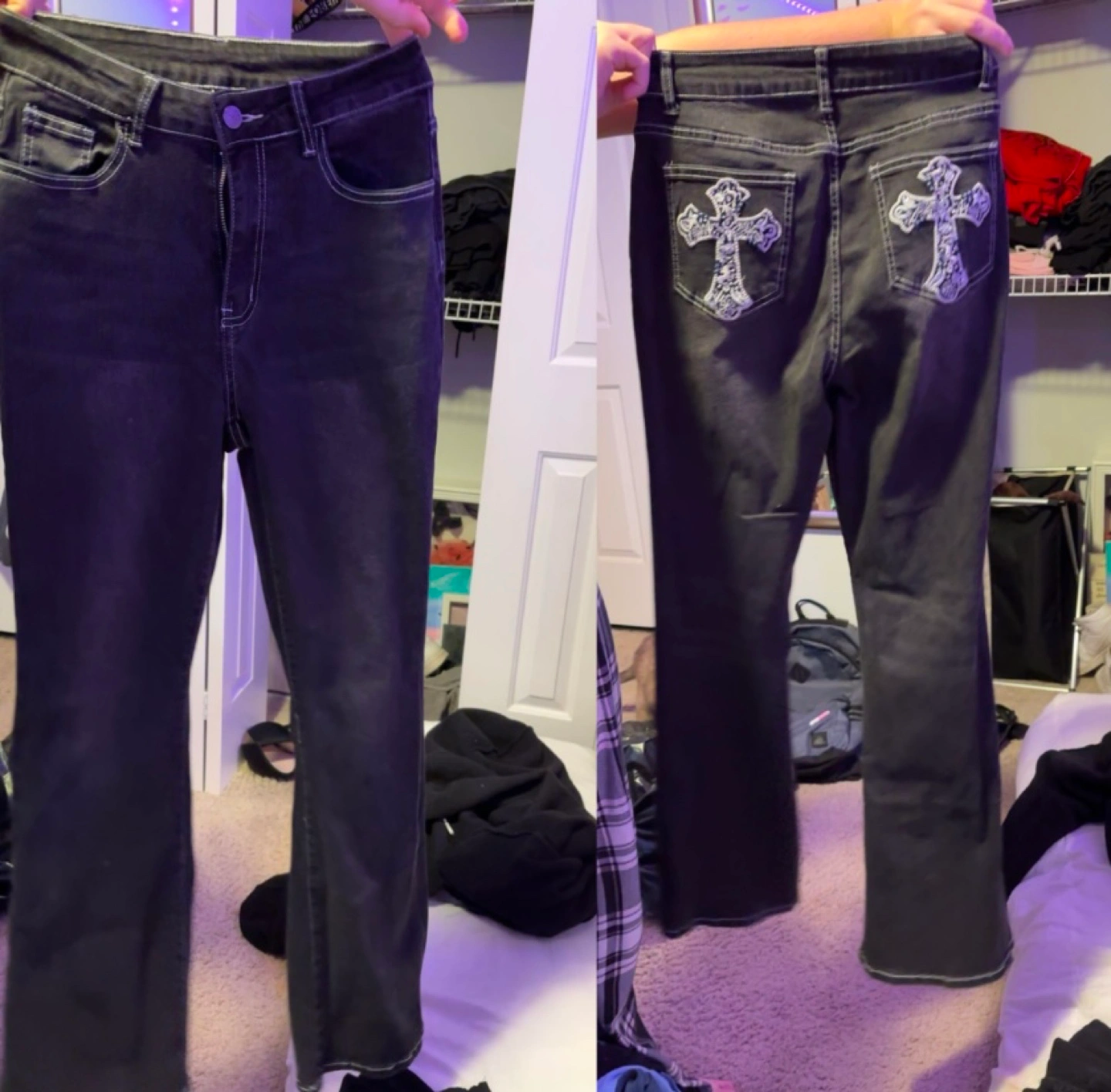 Dark wash bootcut jeans. Embroidered crosses on back pockets. White stitching detail. Size not specified.