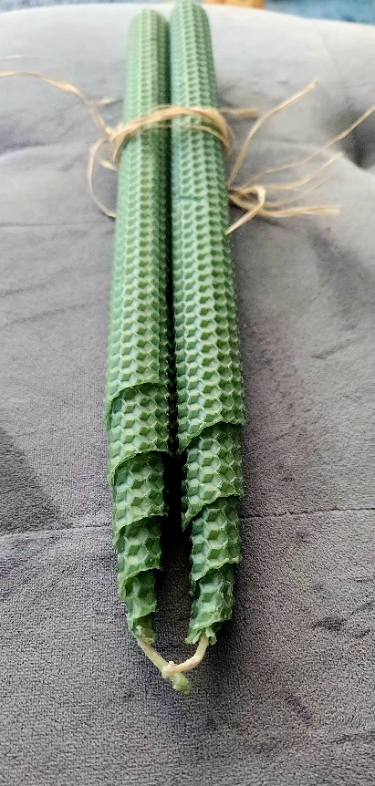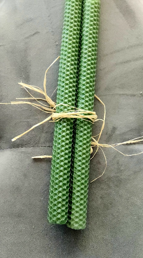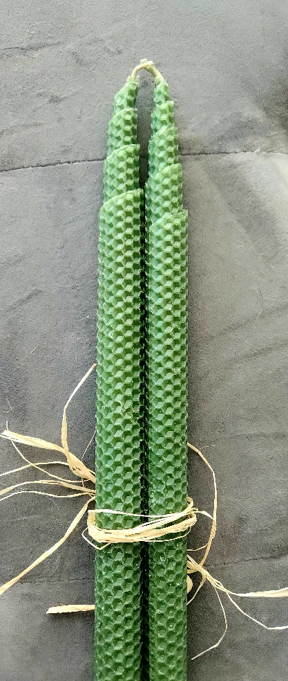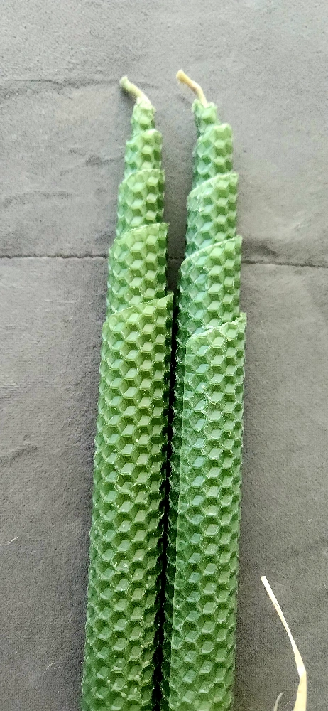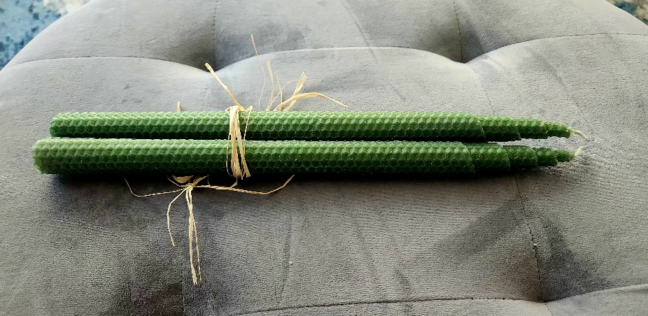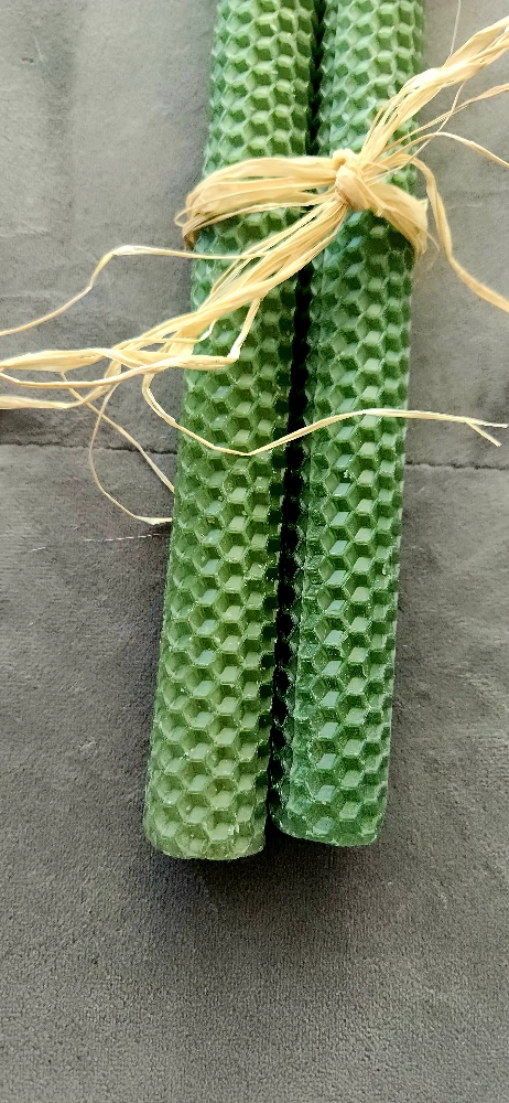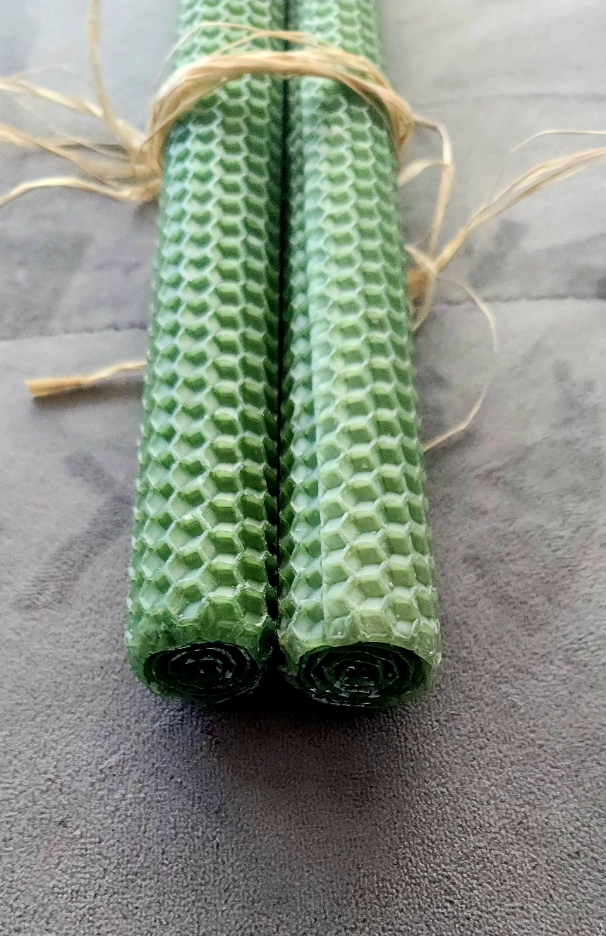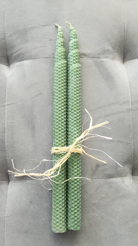 85Extra long hand-rolled beeswax tapered candles in sage green. Measures 14" long and 0.8" wide. Brand new condition.