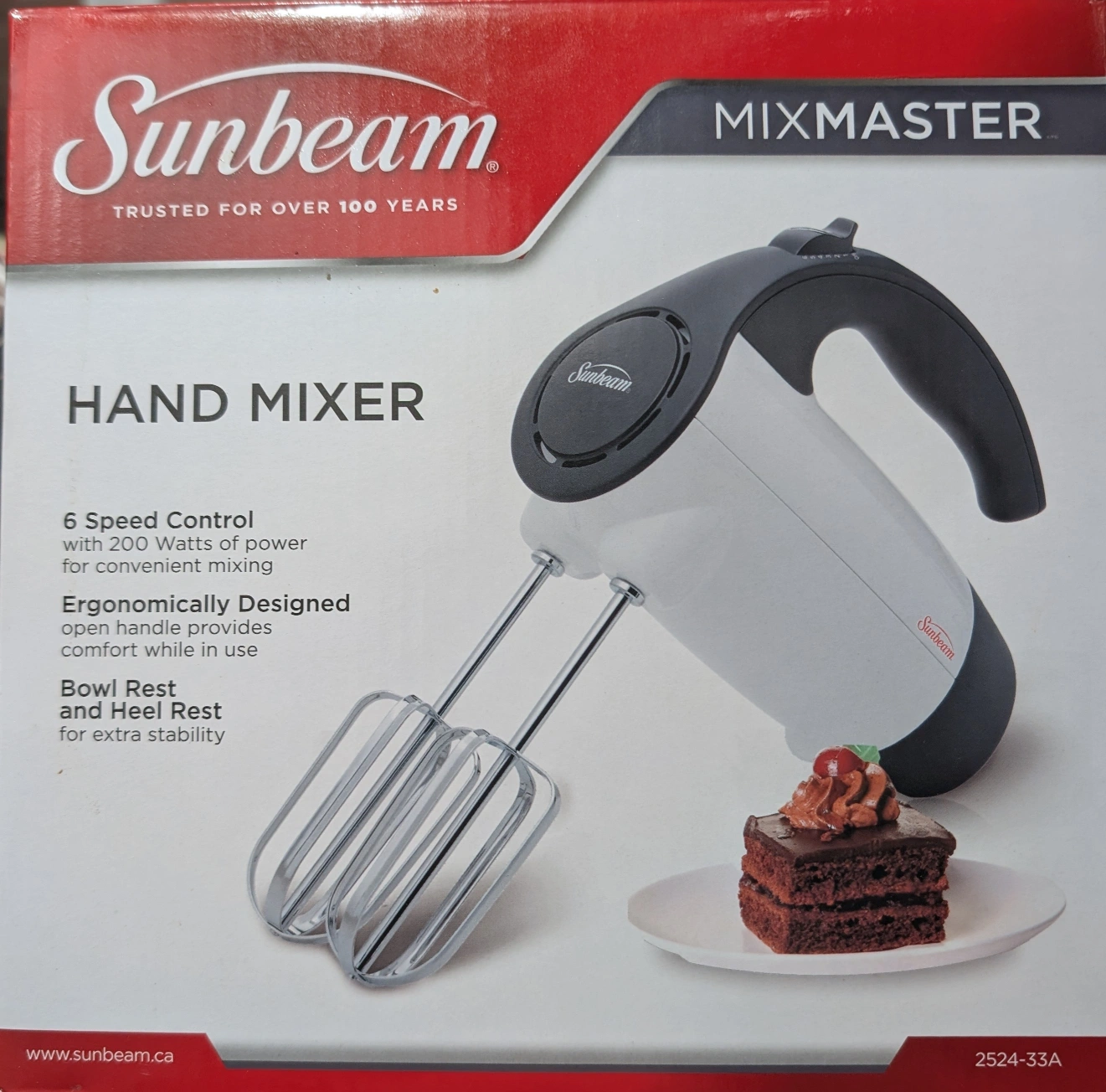 New Sunbeam Mixmaster hand mixer. Six speeds, 200 watts of power. Ergonomically designed.