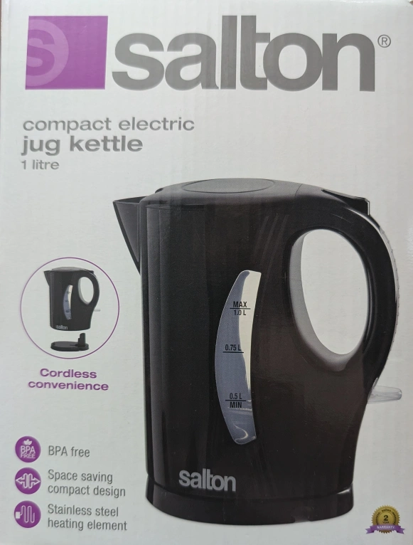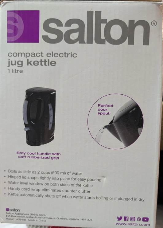 Black electric kettle. Boils up to 2 cups (500 ml) of water. Cordless and features a stay-cool handle. Automatic shutoff. Compact space-saving design. BPA free.