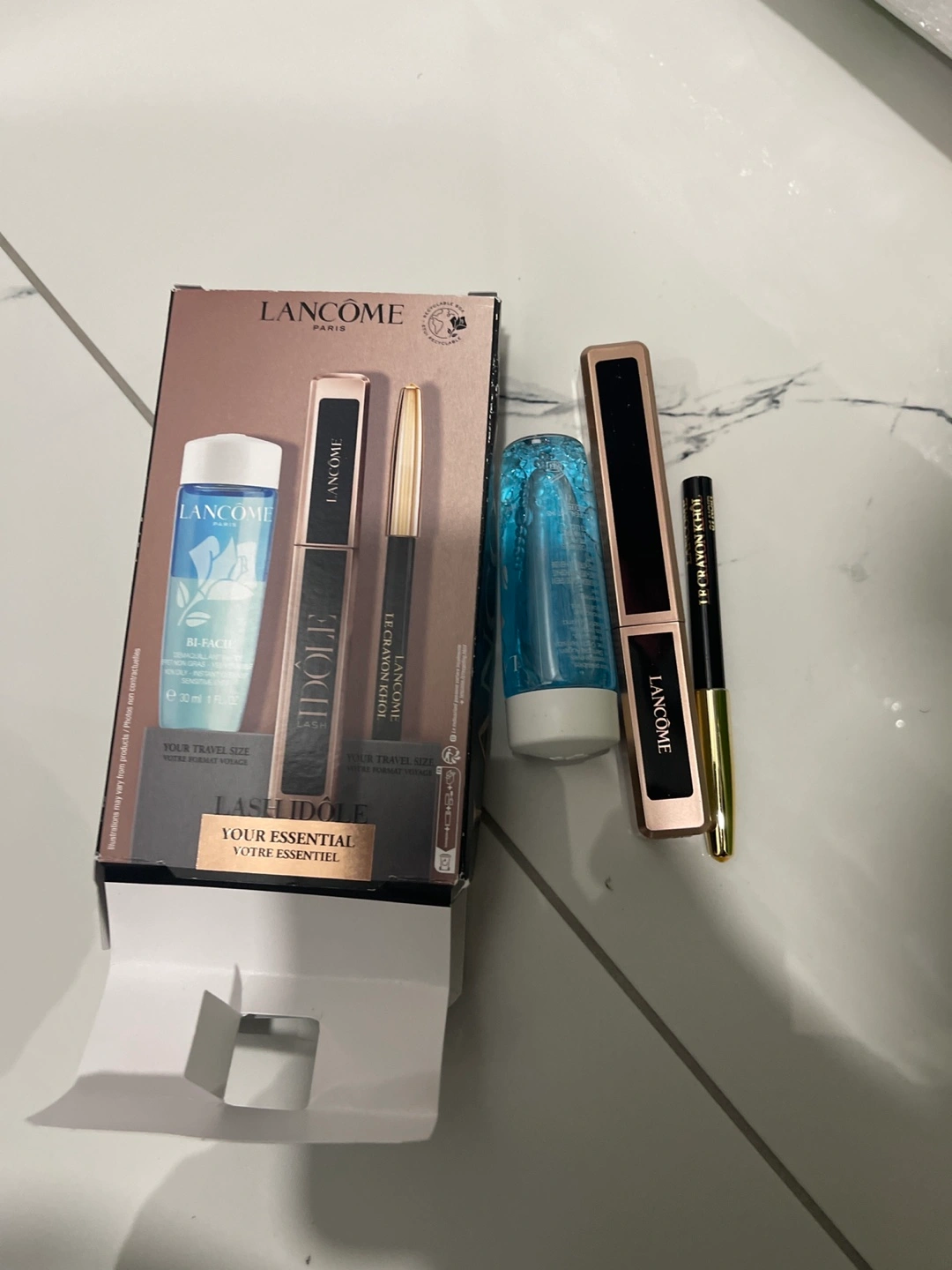 Lancôme travel-sized set. Includes mascara, eyeliner, and makeup remover. Perfect for travel or trying new products.