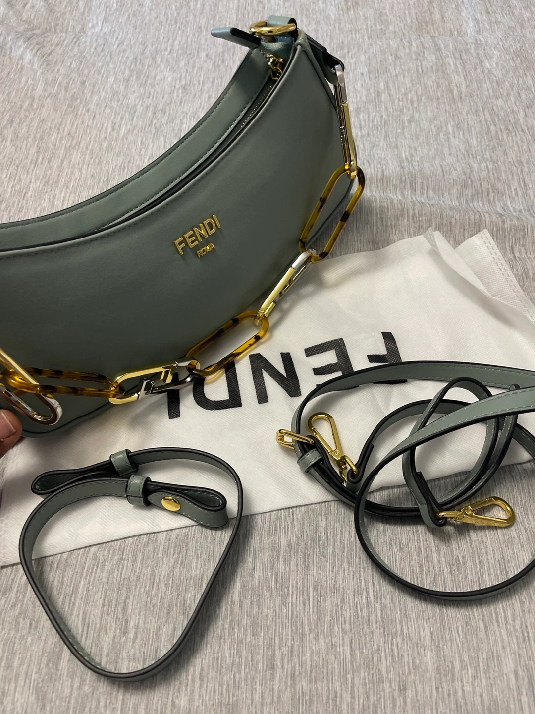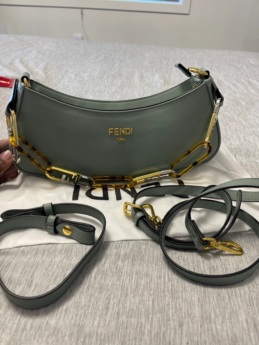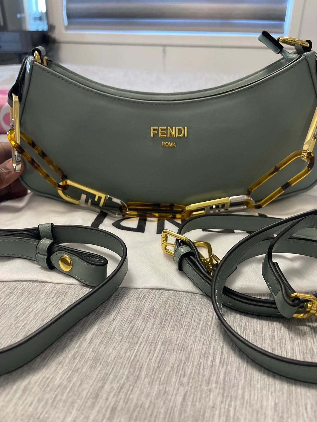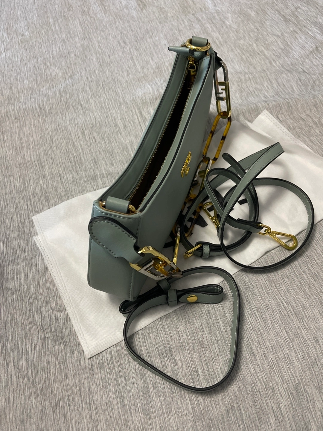 Beautiful pale green Fendi baguette bag. Features a gold chain strap and tortoise accents. Includes dust bag and extra strap. Excellent condition.