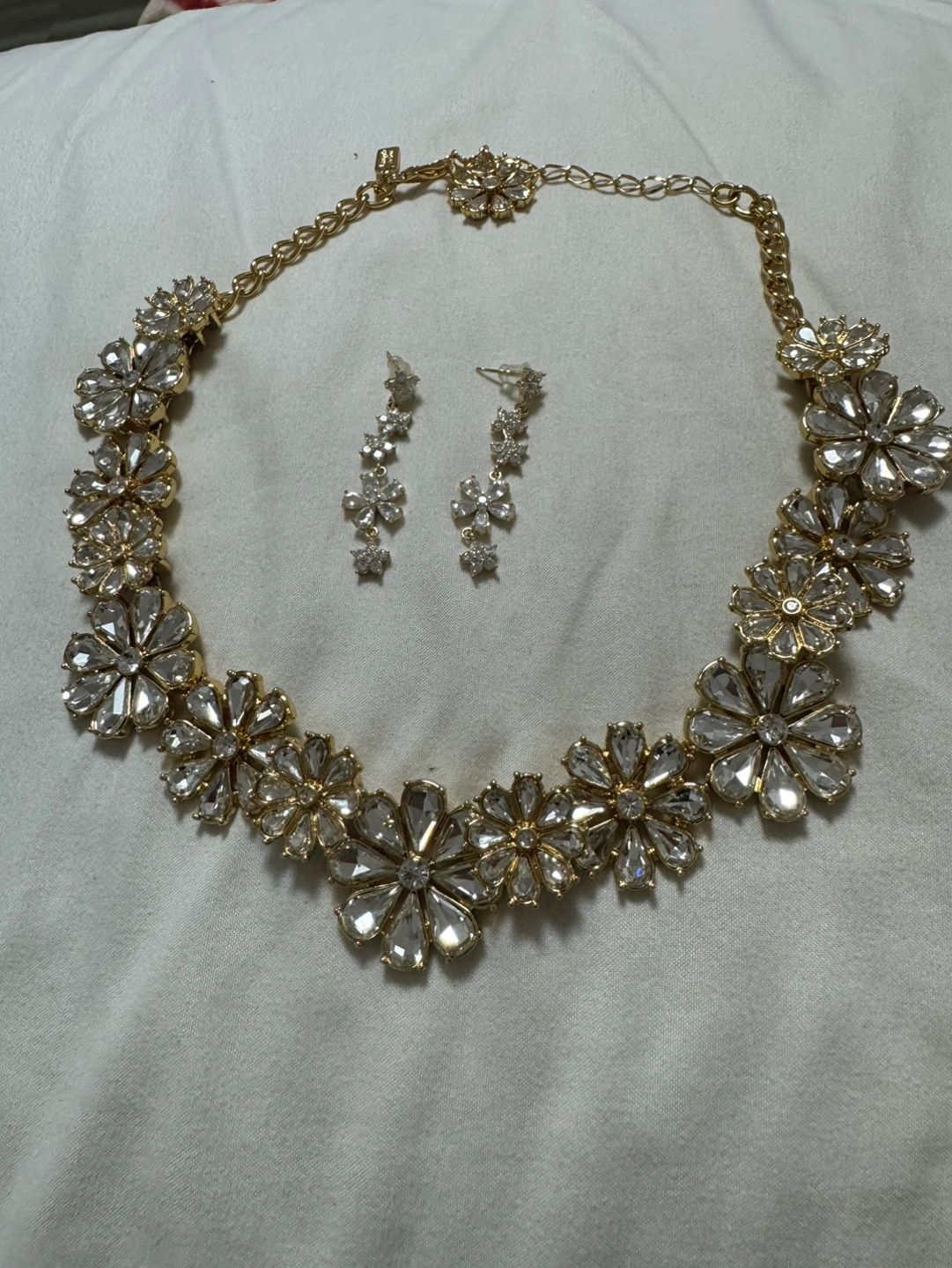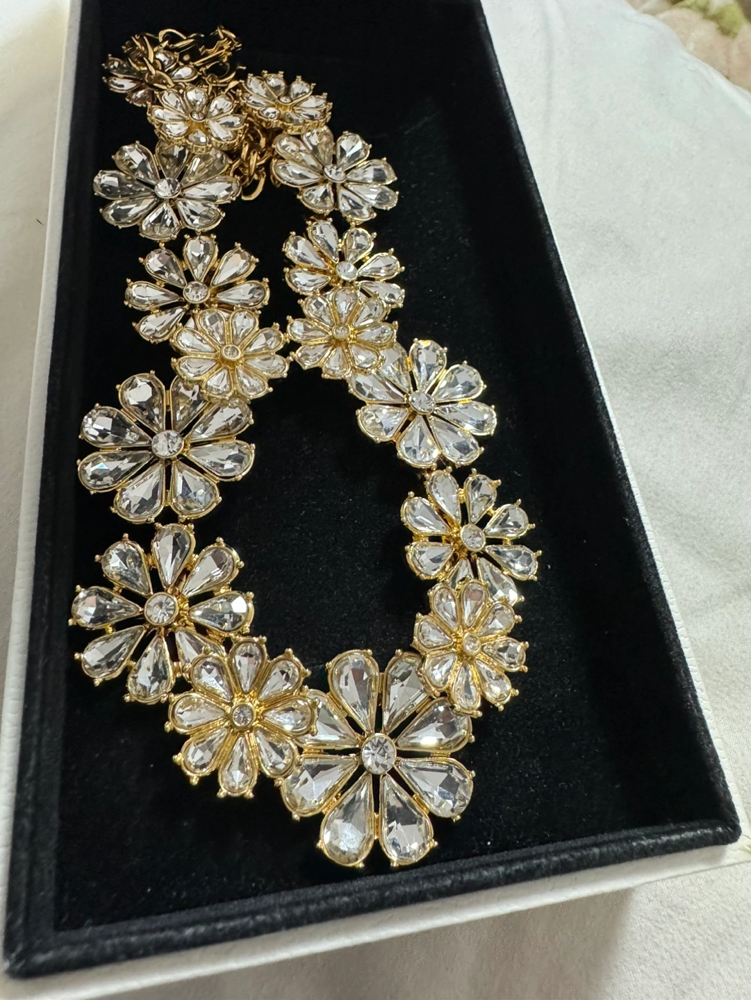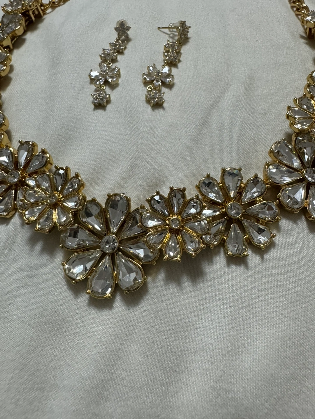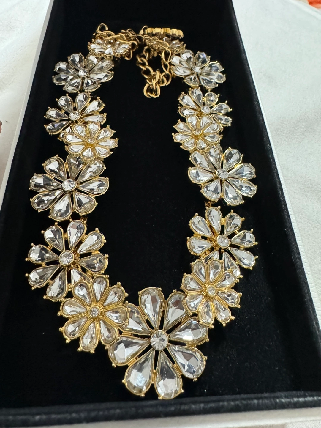 Beautiful gold necklace. Features clear crystal flower accents. Collar style. Elegant and eye-catching.