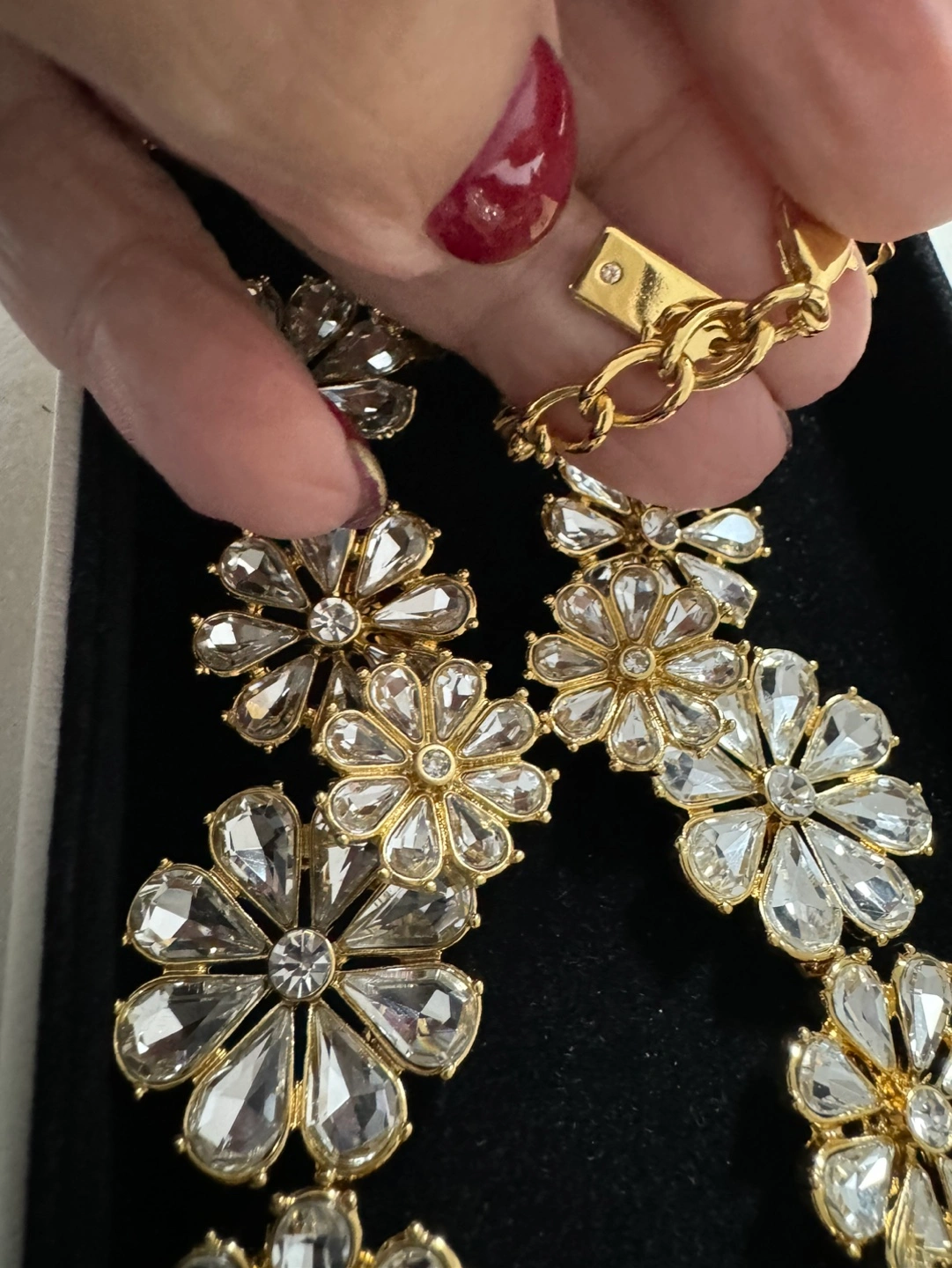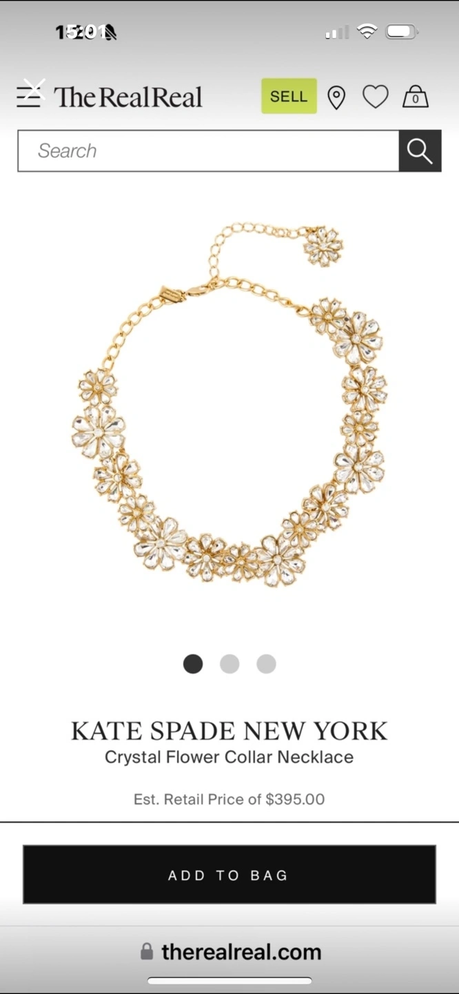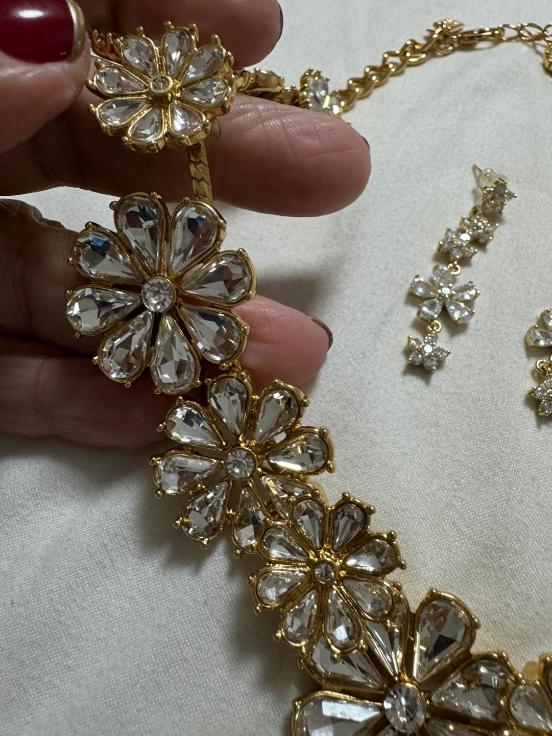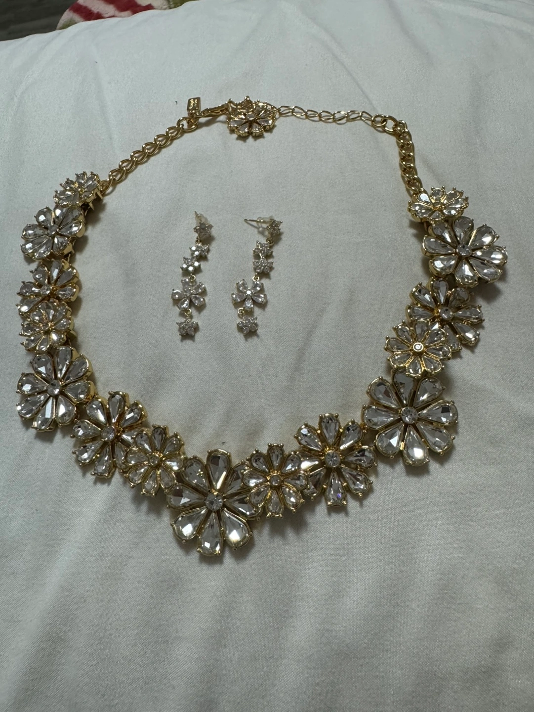 Beautiful gold necklace. Features clear crystal flower accents. Collar style. Elegant and eye-catching.