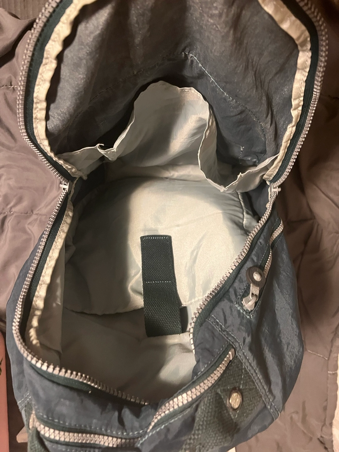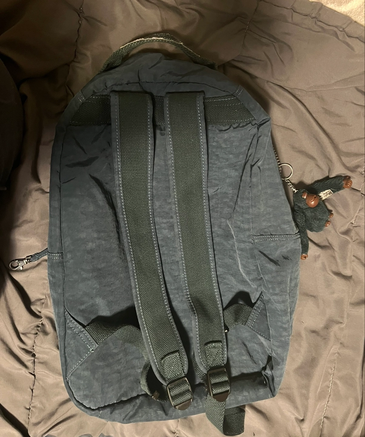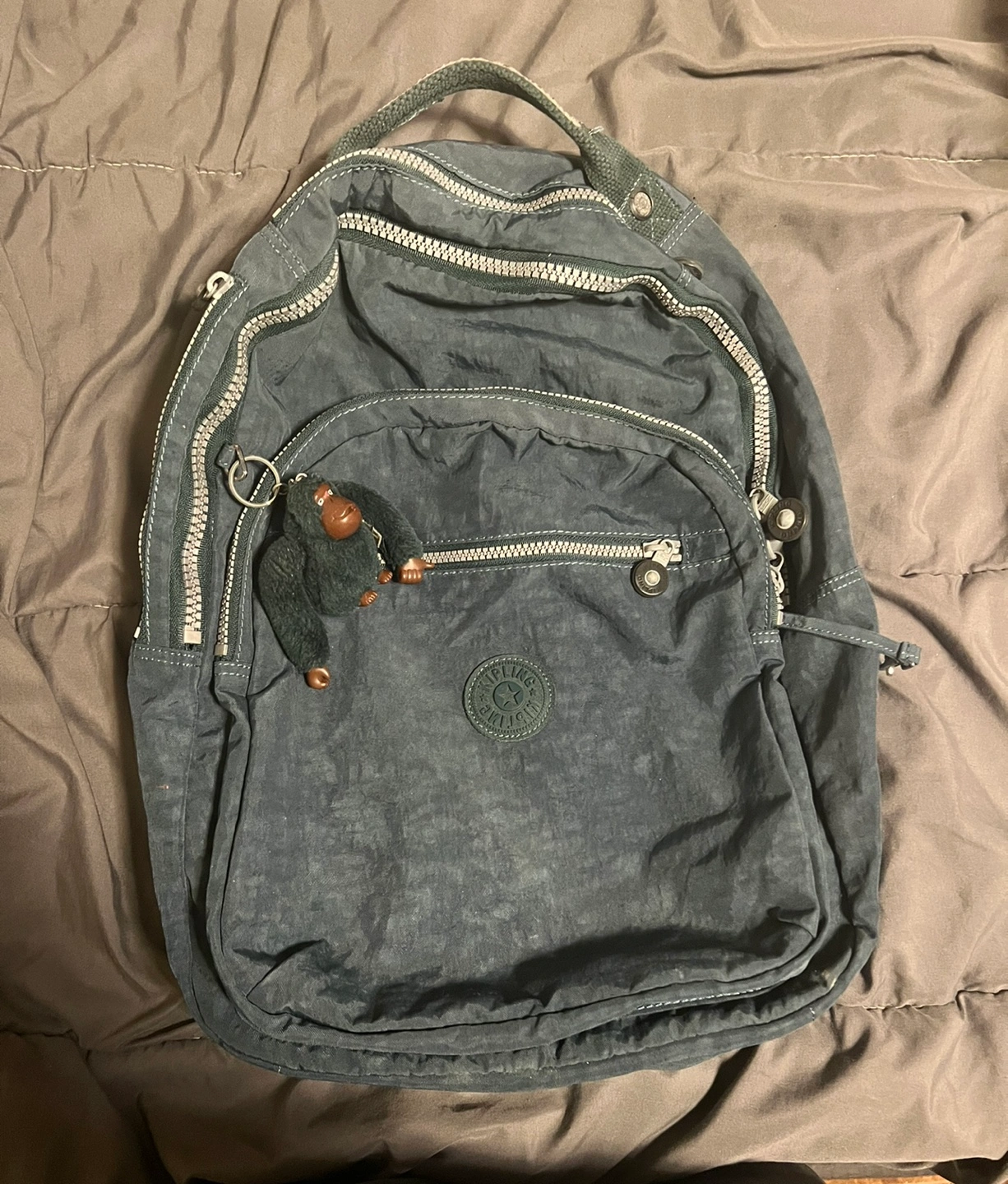 Dark teal Kipling Seoul backpack. Multiple zippered compartments. Adjustable shoulder straps. Small monkey charm attached. Excellent for everyday use.