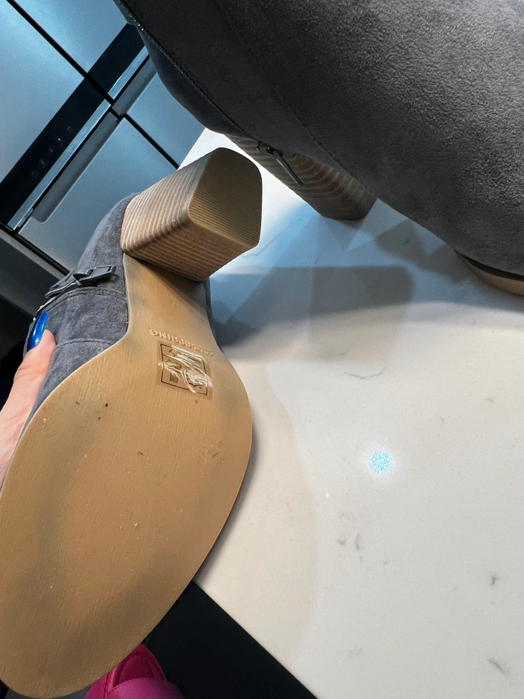Women's grey suede ankle booties. Block heel. Side zipper. Cut-out detail. Size 8.