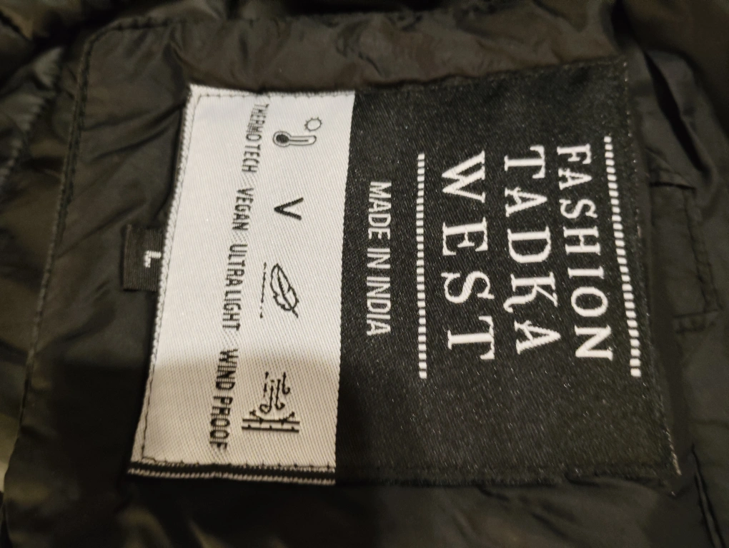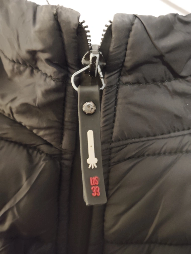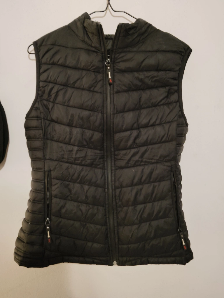 Black sleeveless puffer vest. Size large. Features a zipper closure and two pockets. Lightweight and windproof. Made in India. (Near Finch and Warden)