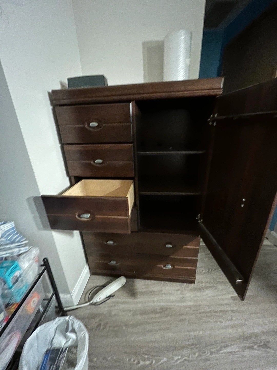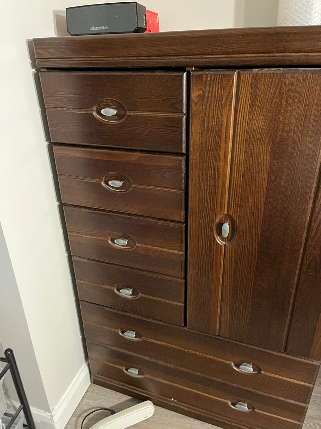 Five drawers and a cupboard with three shelves. Dark brown wood finish. Good used condition. Solid wood construction. Ideal for bedroom storage.