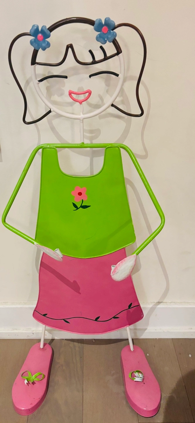 Adorable metal coat rack shaped like a girl. Features a bright green dress and pink skirt. Pink sandals complete the look. Perfect for a child's room.