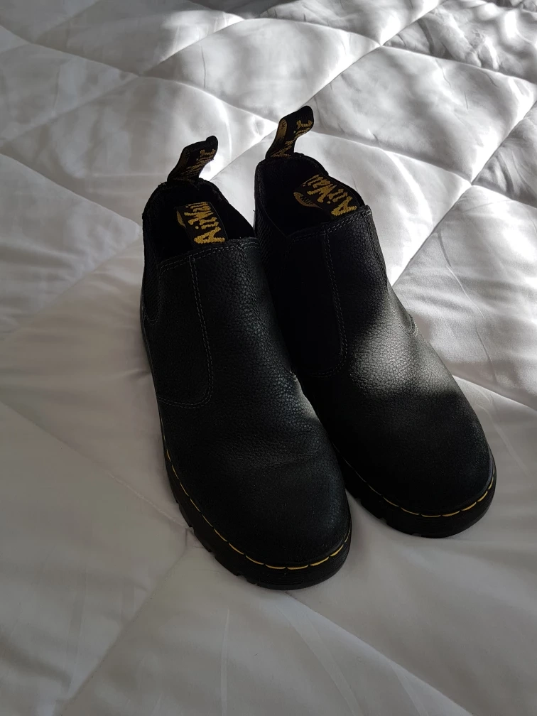Black leather Dr. Martens chelsea boots. Size 41 women's. Made in China. Slip resistant soles. Mint condition. Please also check out my other listings on this account. This is a no pet/ smoke home. Pick Up Cochrane, Alberta.
