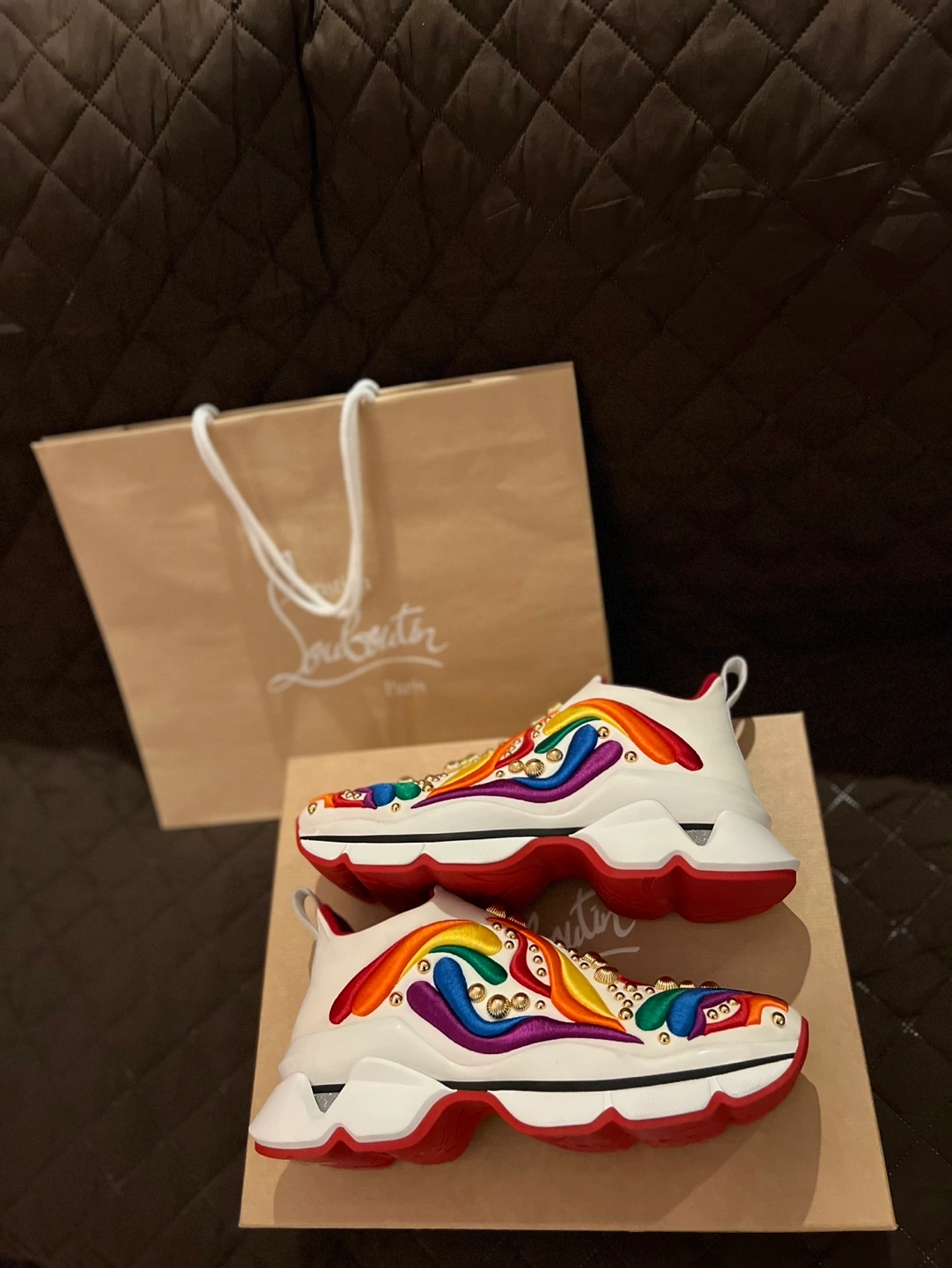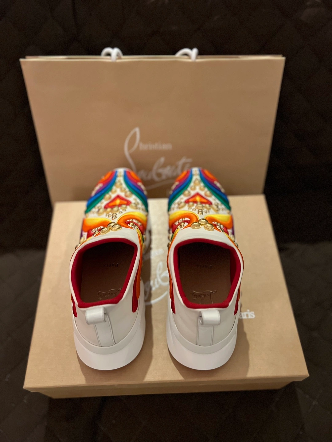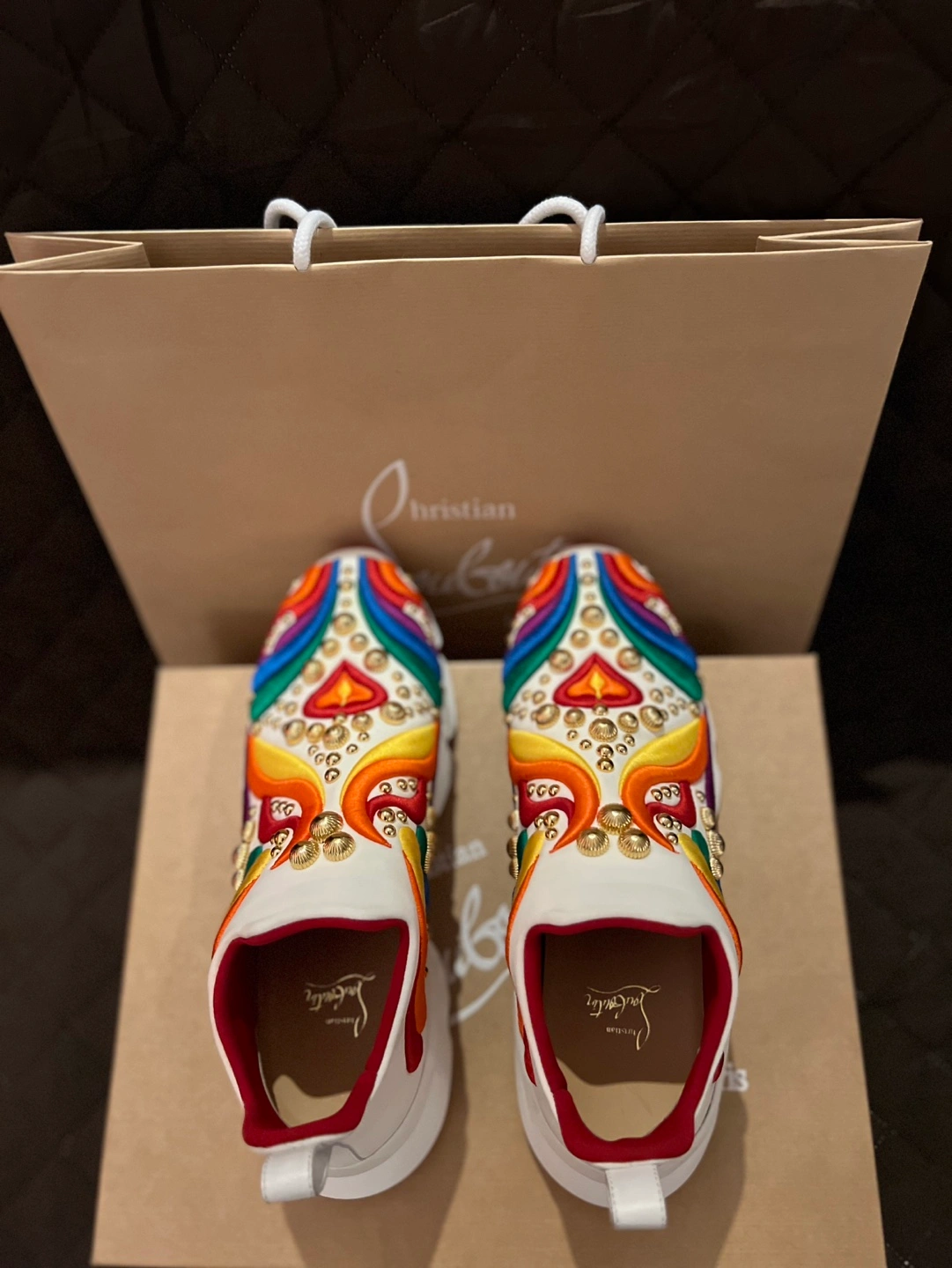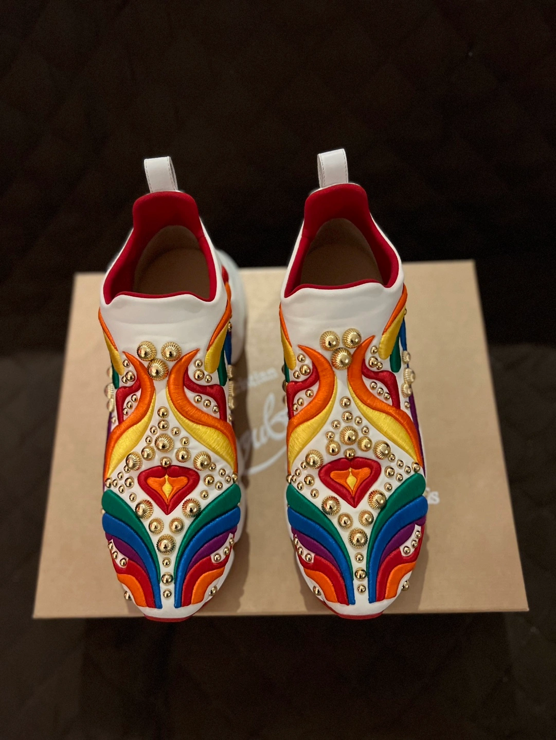 45Brand New Christian Louboutin sneakers. Rainbow embroidery and gold embellishments. White leather upper, red sole. Comes with box and Louboutin bag. Originally over $1400 plus taxes.