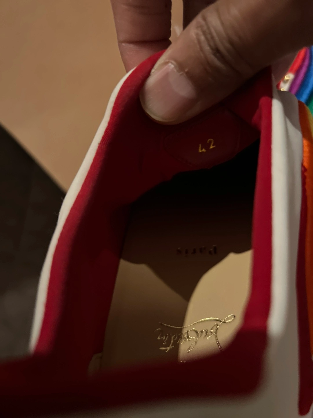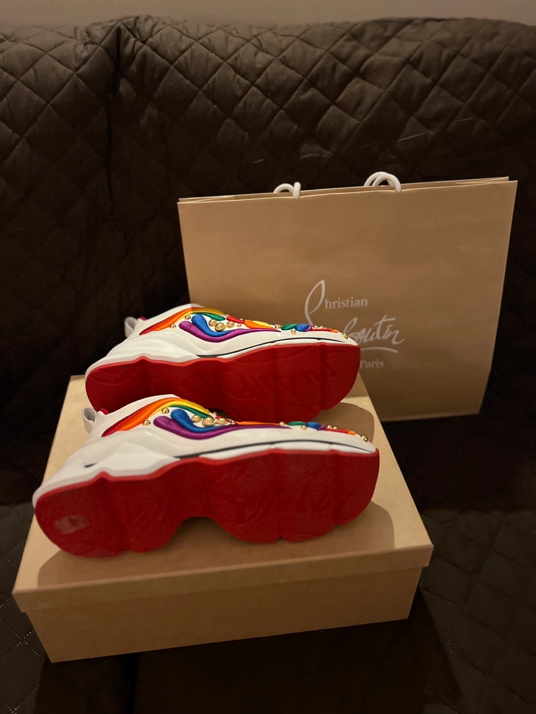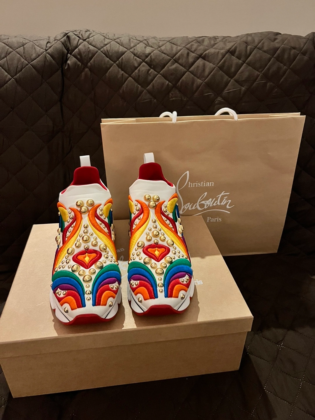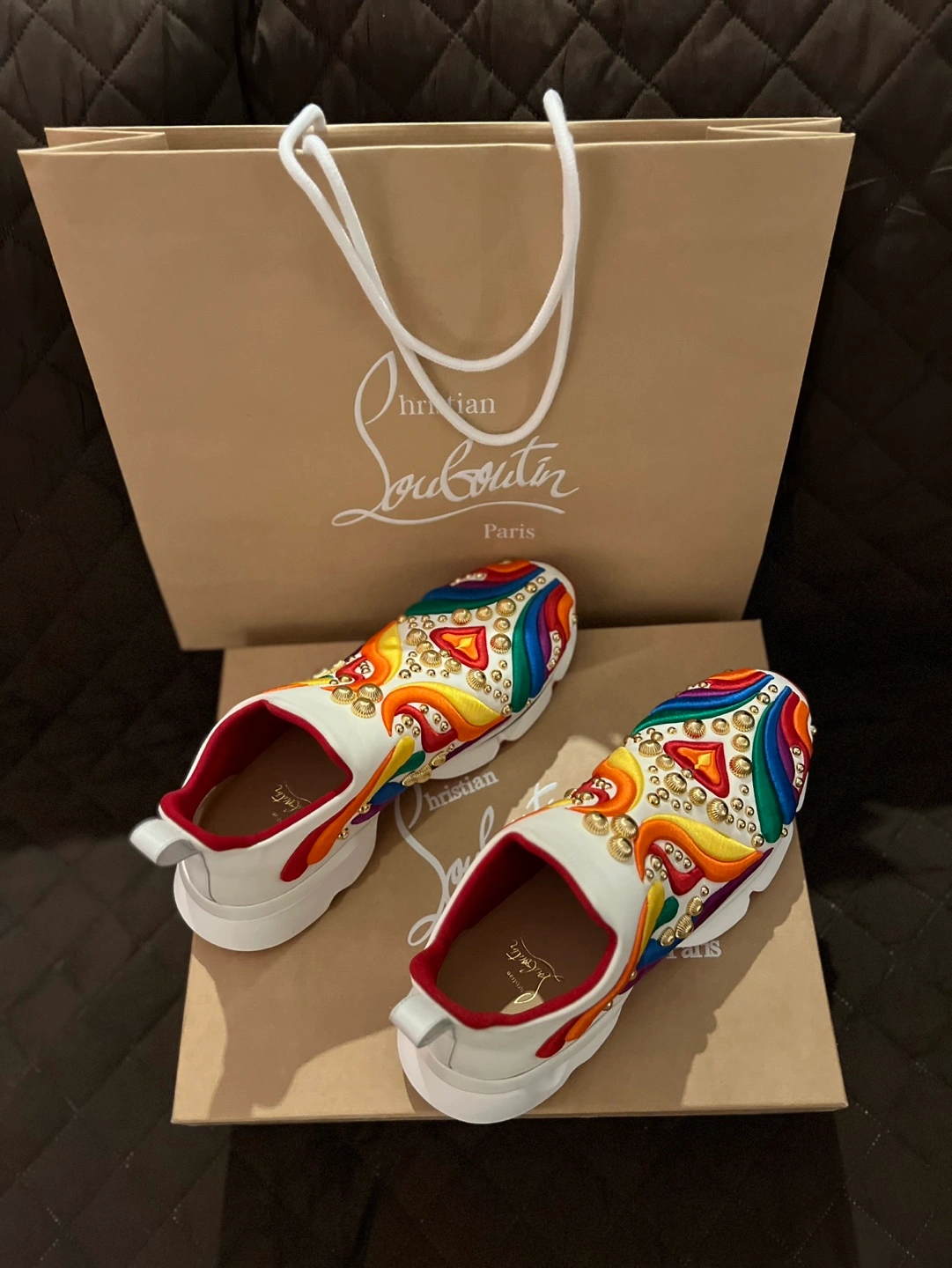 45Brand New Christian Louboutin sneakers. Rainbow embroidery and gold embellishments. White leather upper, red sole. Comes with box and Louboutin bag. Originally over $1400 plus taxes.