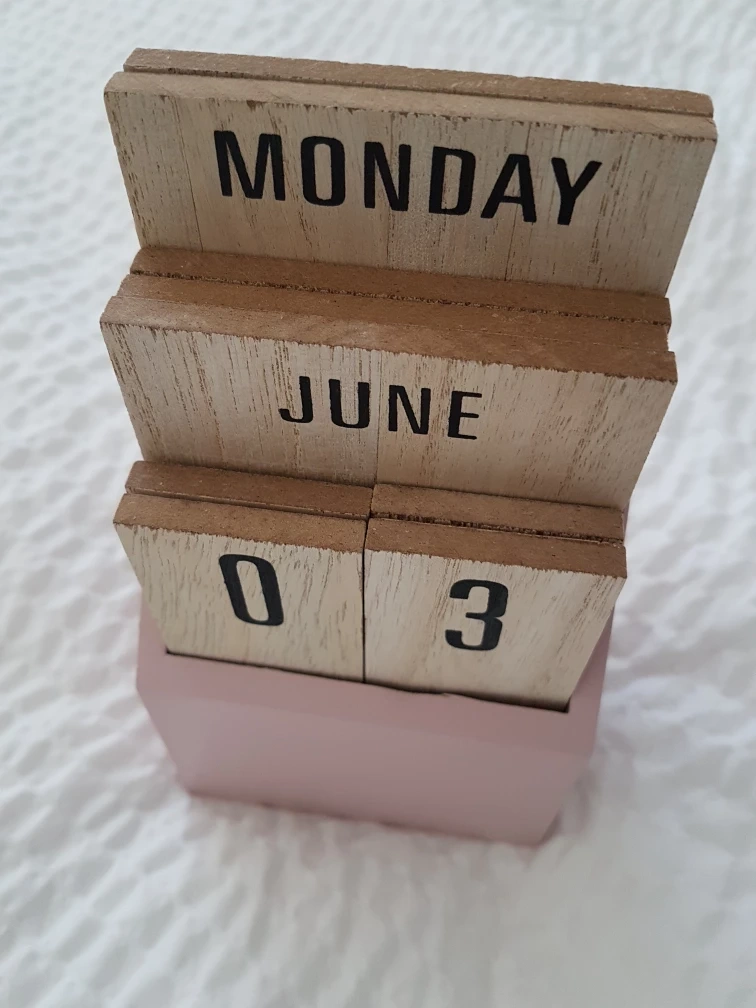 Adorable pink perpetual desk calendar. Features interchangeable wooden blocks for days, months, and numbers. Perfect for home or office. Please also check out my other listings on this account. This is a no pet/ smoke home. Pick Up Cochrane, Alberta.