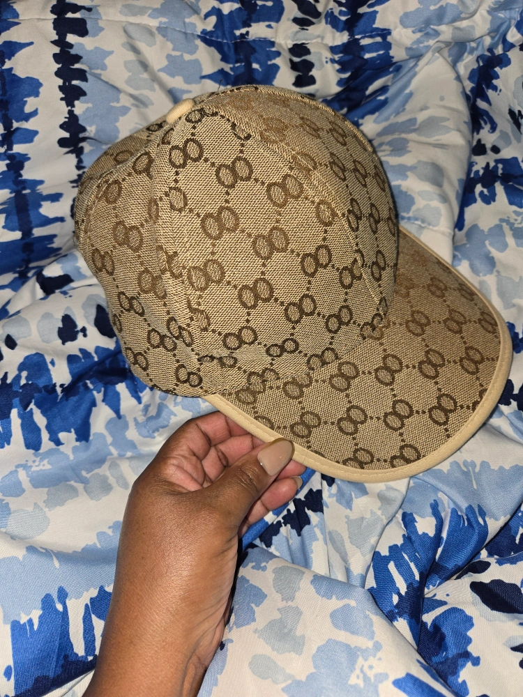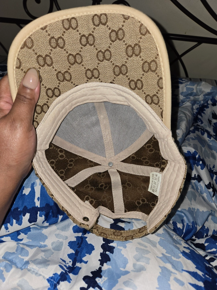 Brown and beige baseball cap. Features a Gucci-inspired pattern. Adjustable back strap. 100% cotton. Made in China✨️🧢