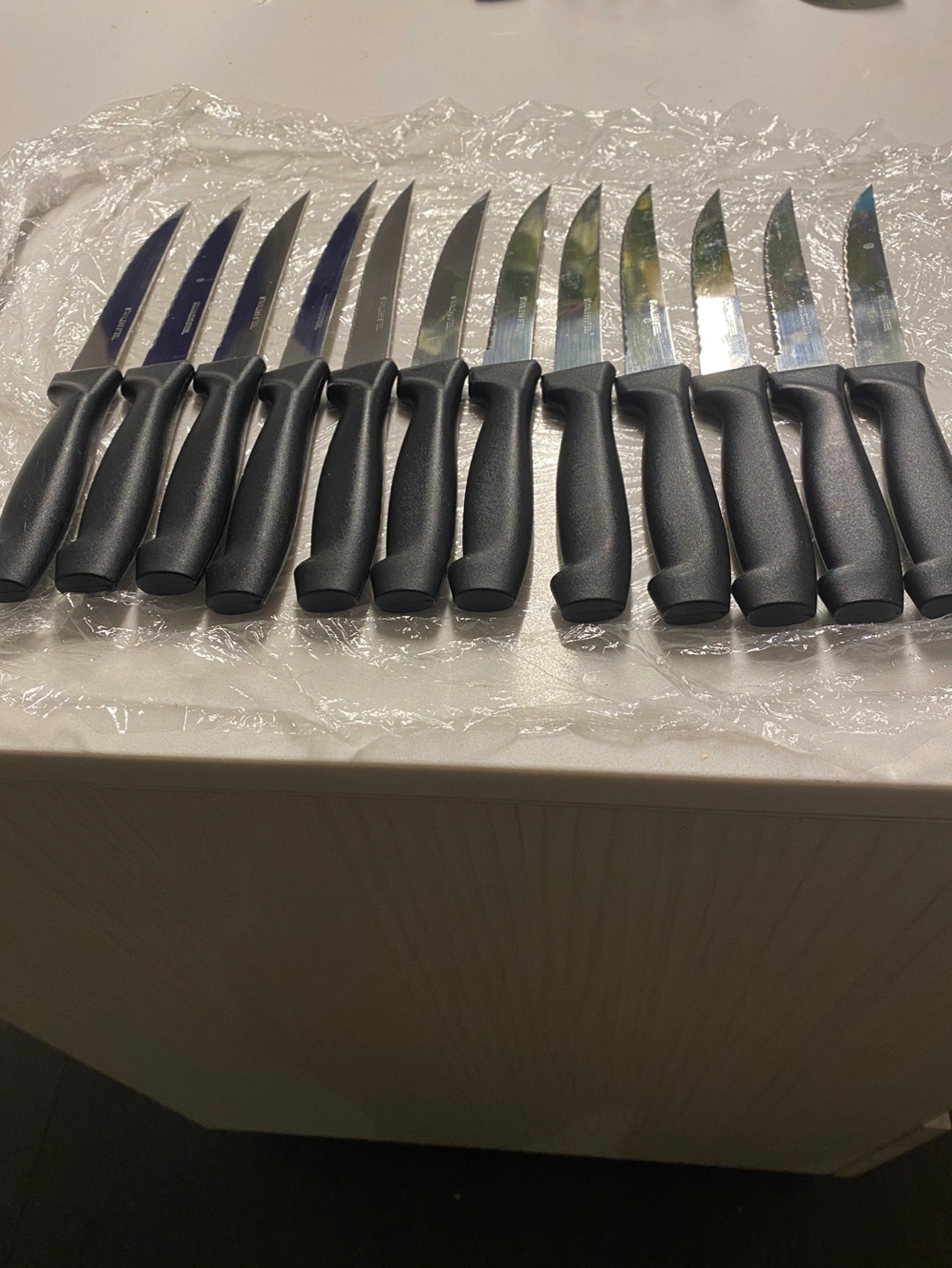 Twelve steak knives, black handles, stainless steel blades. New, unused. Great for entertaining.