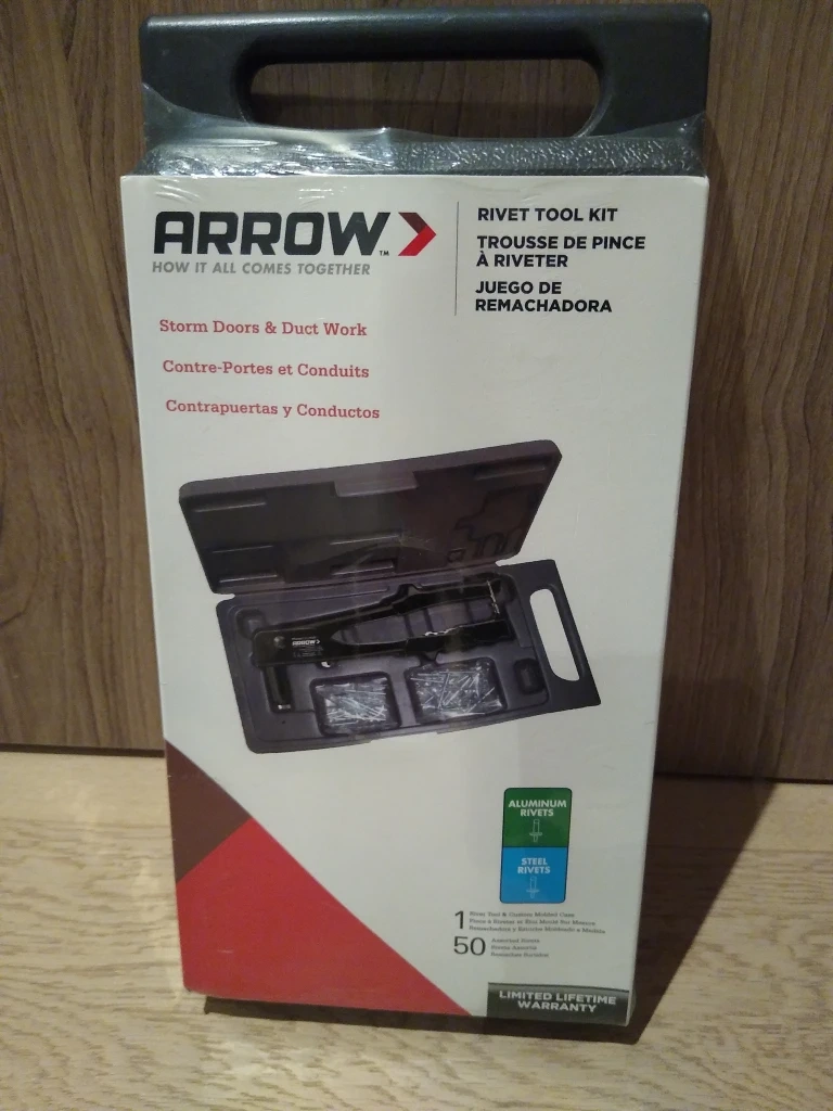 Brand New in packaging. Includes rivet tool, 50 rivets (aluminum and steel) and a case.