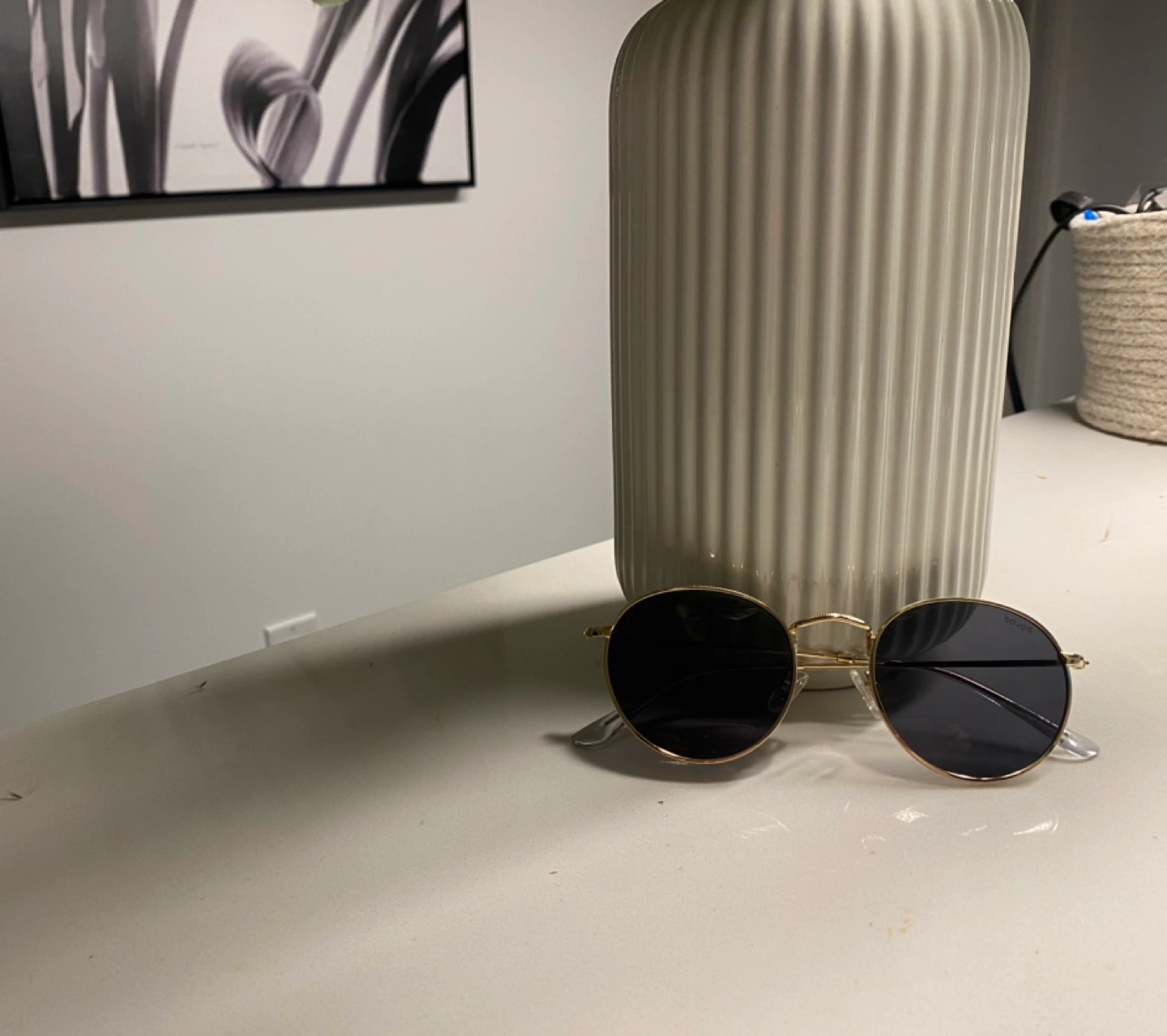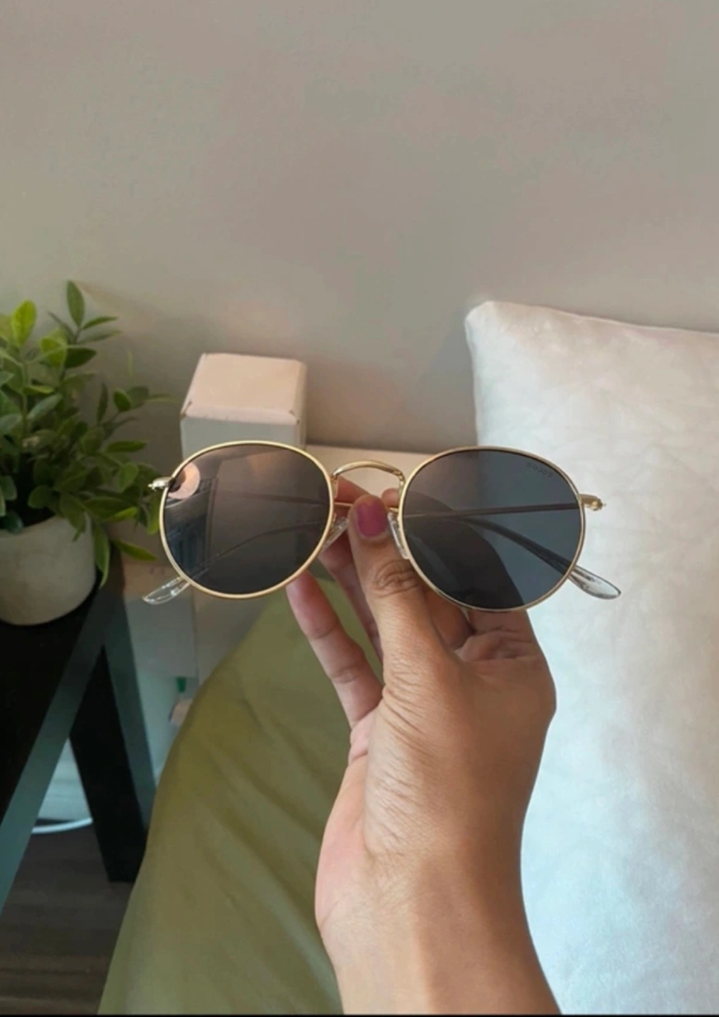 Round metal frame sunglasses. Dark grey lenses. Gold coloured metal arms. Good condition.