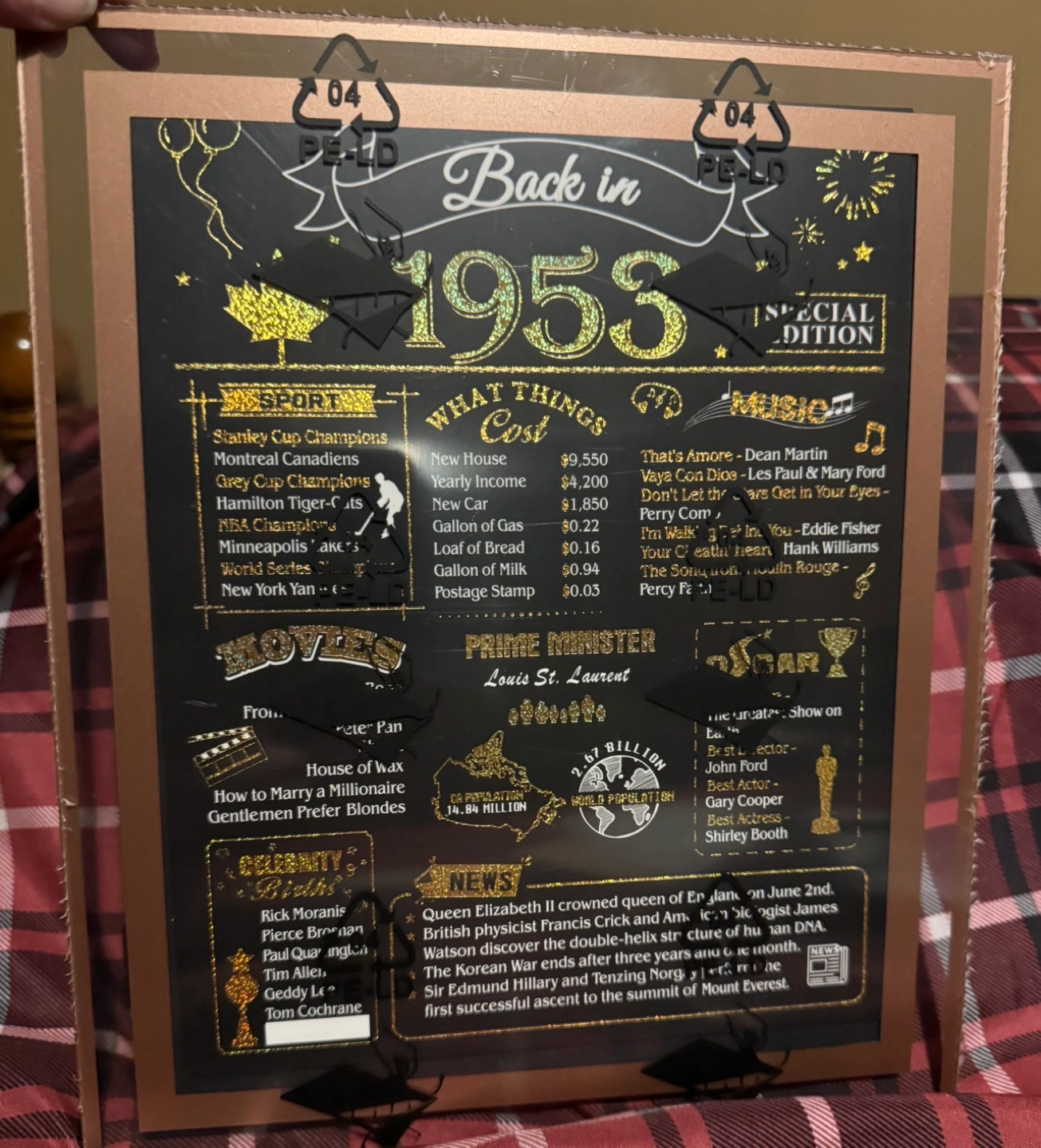Gold-coloured text on a black background. Features details from 1953, including sports, music, movies, costs of everyday items, news, and prime minister. Presented in a clear acrylic frame.